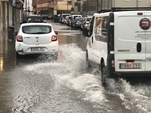 En Plata d’en Bossa, algunas calles han quedado también anegadas por completo y durante algunos minutos han permanecido cerradas, puesto que algunos contenedores de basura han sido desplazados al centro de la vía arrastrados por el agua.
