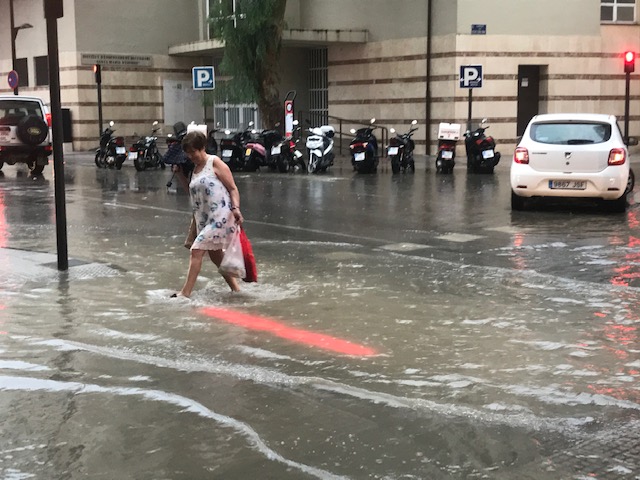 @Noudiari / La lluvia ha vuelto a sumir la ciudad de Ibiza en un caos. Calles inundadas, excrementos saliendo a borbotones de las alcantarillas, trabajadores achicando agua del interior de sus locales e importantes retenciones en las principales avenidas de la ciudad. Estas han sido, entre otras, las principales complicaciones que ha supuesto el aguacero de esta mañana, que ha empezado sobre las nueve y media de la mañana y que ha durado escasamente 30 minutos.