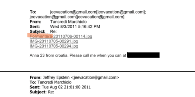 El 3 de agosto de 2011, el difunto multimillonario Jeffrey Epstein, investigado por tráfico sexual, escribió un mail a Tancredi Marchiolo, ejecutivo inversor, con una pregunta: “Estaré en Roma este fin de semana, ¿recomiendas alguna chica?”.