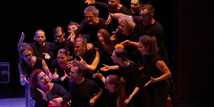 El espectáculo arranca con una escena aparentemente sencilla: un operario deja un piano de cola en un escenario vacío y oscuro. Sin embargo, en pocos segundos la magia del teatro transforma el espacio en un concierto muy especial en el que los protagonistas no son cantantes convencionales, sino tramoyistas, sastres, técnicos de iluminación y otros trabajadores del mundo escénico que construyen todo el universo sonoro únicamente con sus propias voces.