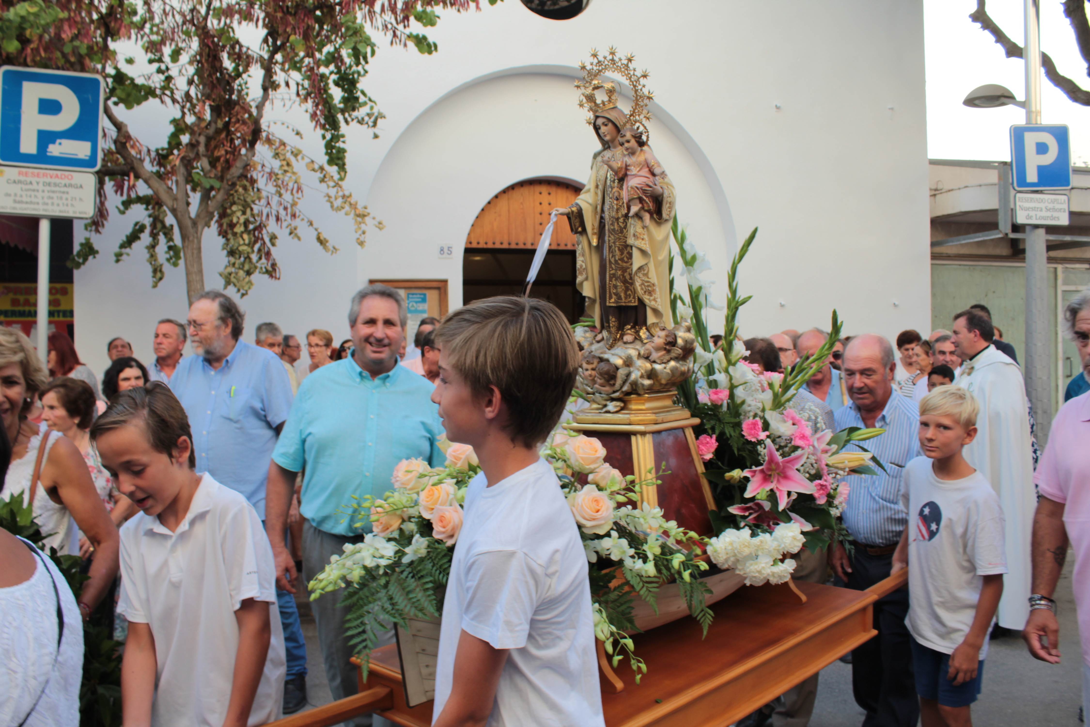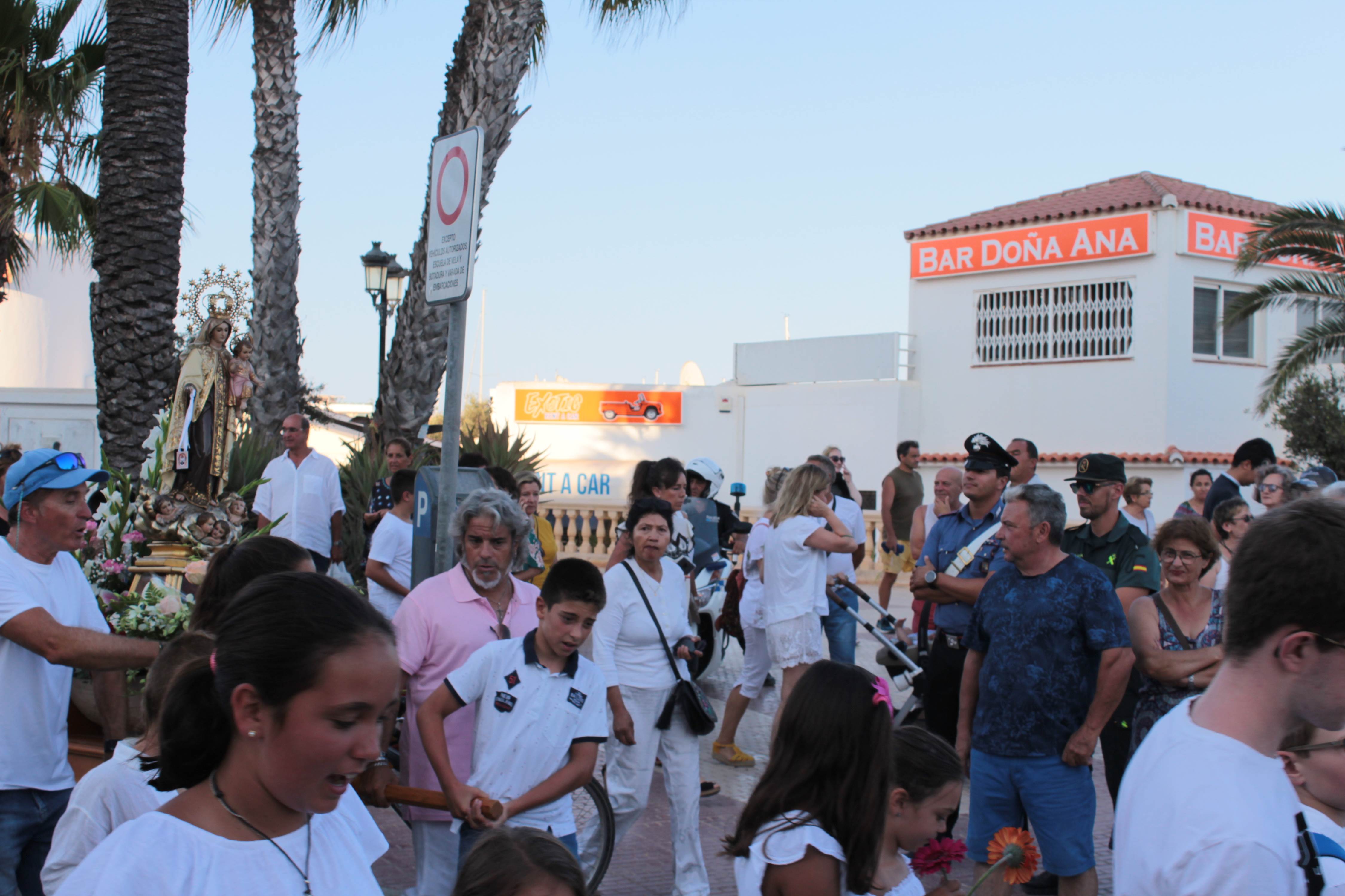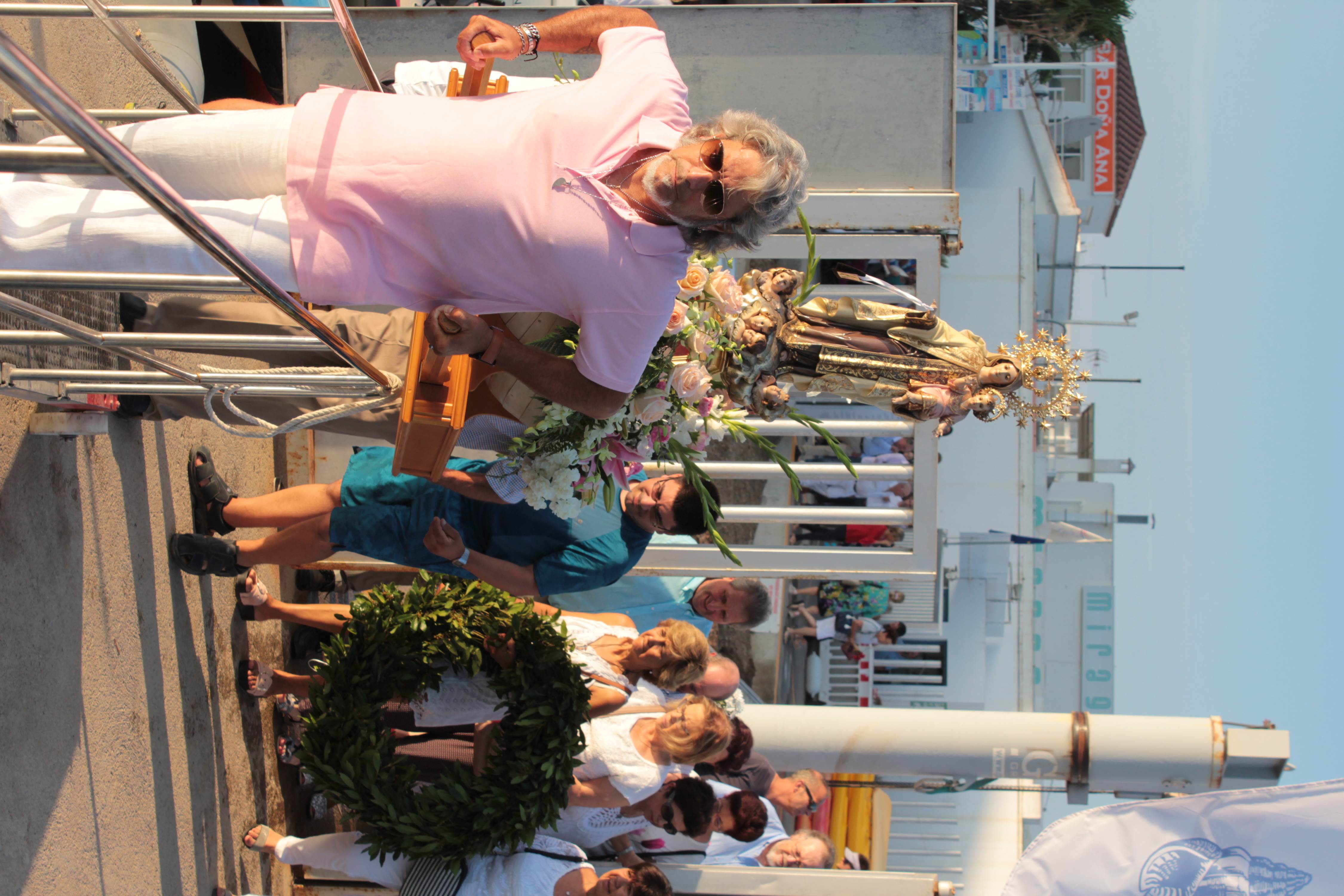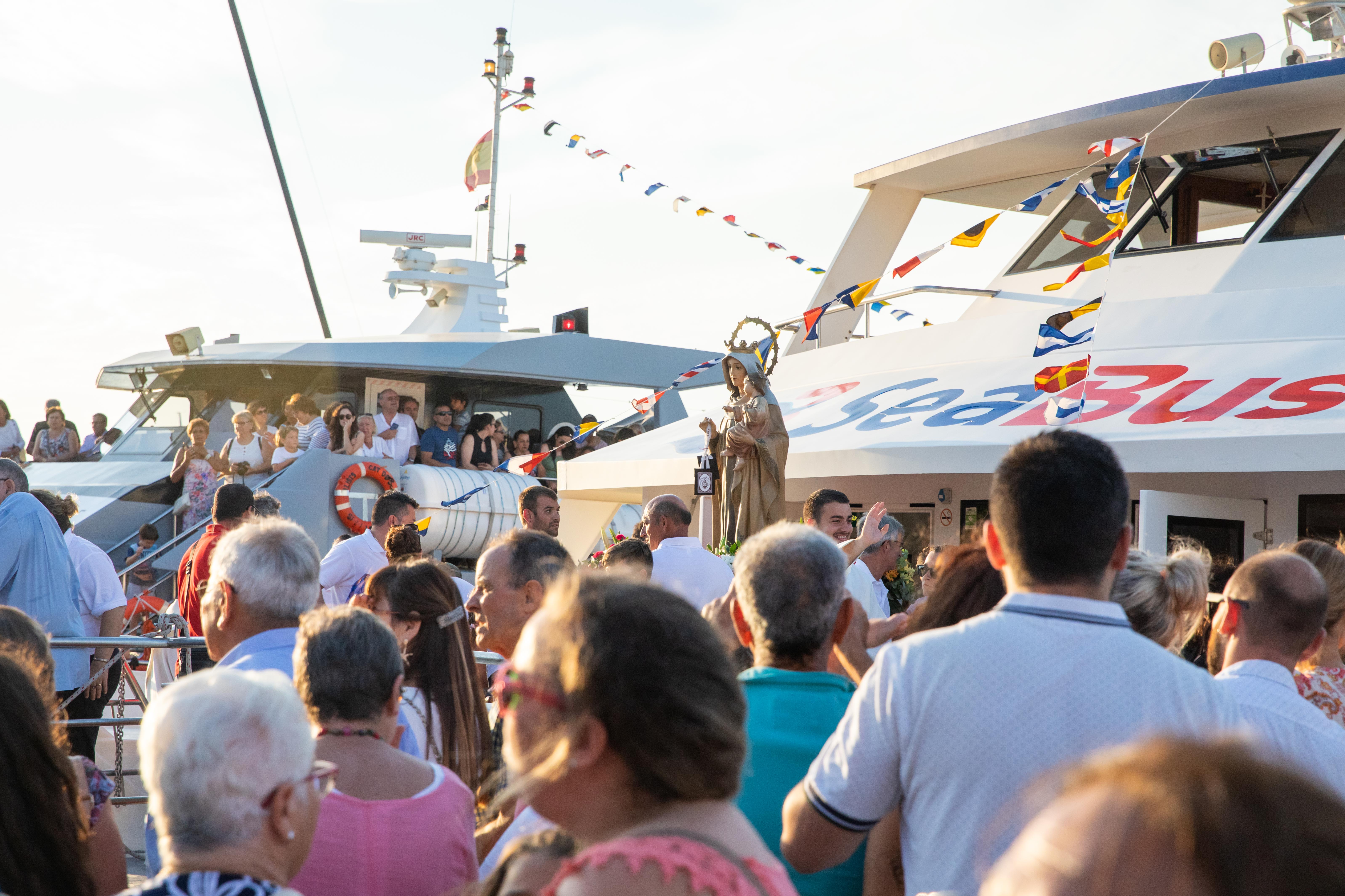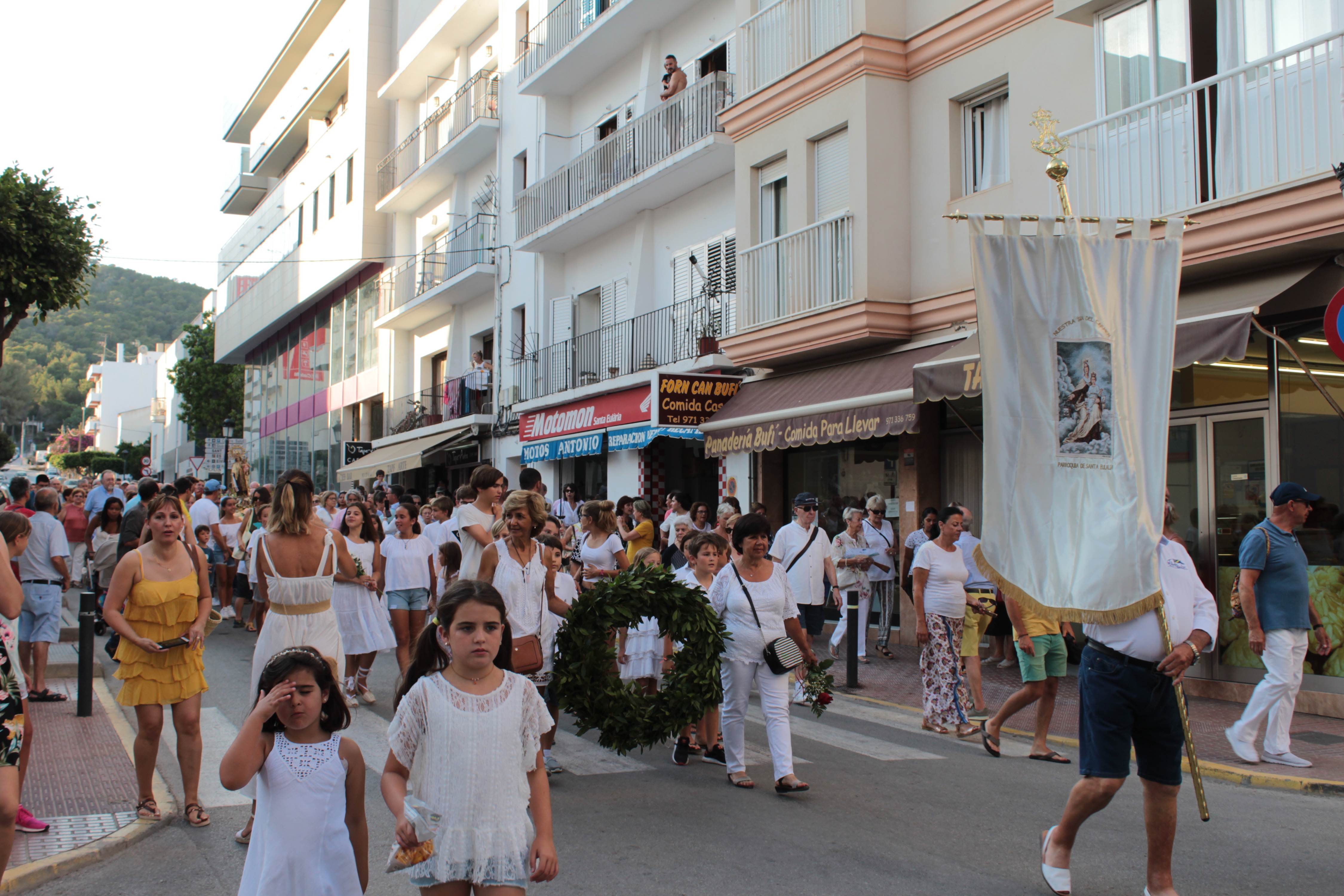 El programa ha consistido en una misa en la capilla de Lurdes, en la calle Sant Jaume de la Vila des Riu, seguida de una procesión hasta llegar al embarcadero de las golondrinas, donde se ha iniciado una pequeña travesía hasta la entrada de la bahía, donde se ha hecho una ofrenda foral para todos aquellos que han perdido la vida en el mar.