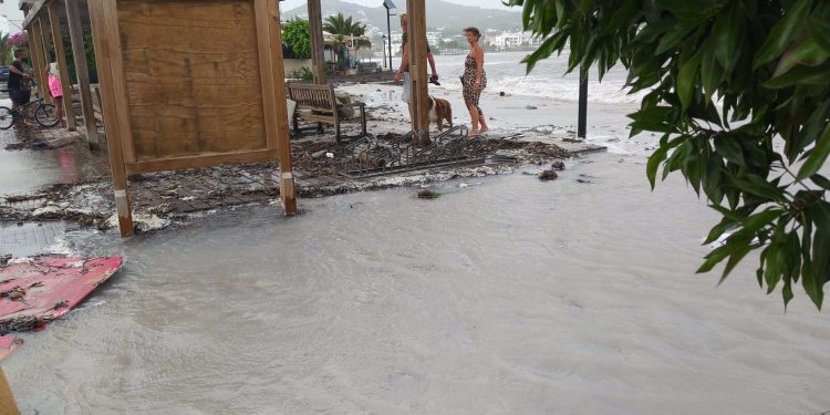 El Ayuntamiento de Ibiza ha cerrado esta mañana la playa al baño como consecuencia de la llegada de restos de una embarcación a la deriva cuyos ocupantes han podido escapar indemnes de las consecuencias del mal tiempo. Poco después el oleaje ha ido en aumento y la zona de baño ha quedado totalmente anegada por el agua salada empujada por el vendaval que ha azotado la isla de costa a costa.
