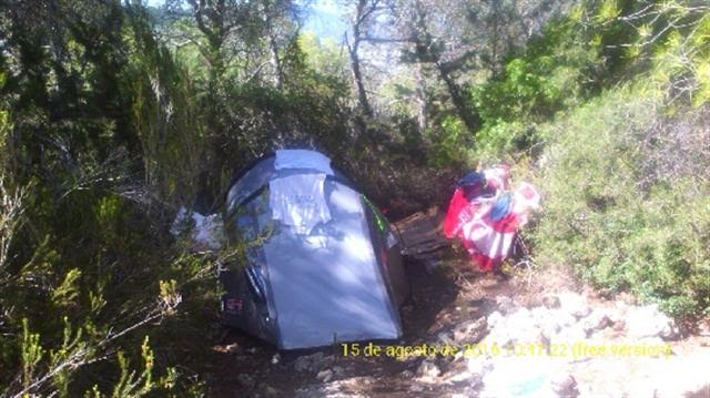 @Noudiari/ La unidad de medio ambiente de la Policía Local de Sant Antoni desmontó y retiró ayer dos tiendas de campaña de una zona boscosa con gran riesgo de incendio en sa Talaia de Sant Antoni. Junto a las tiendas se hallaron y retiraron diferentes enseres para hacer fuego y cocinar.