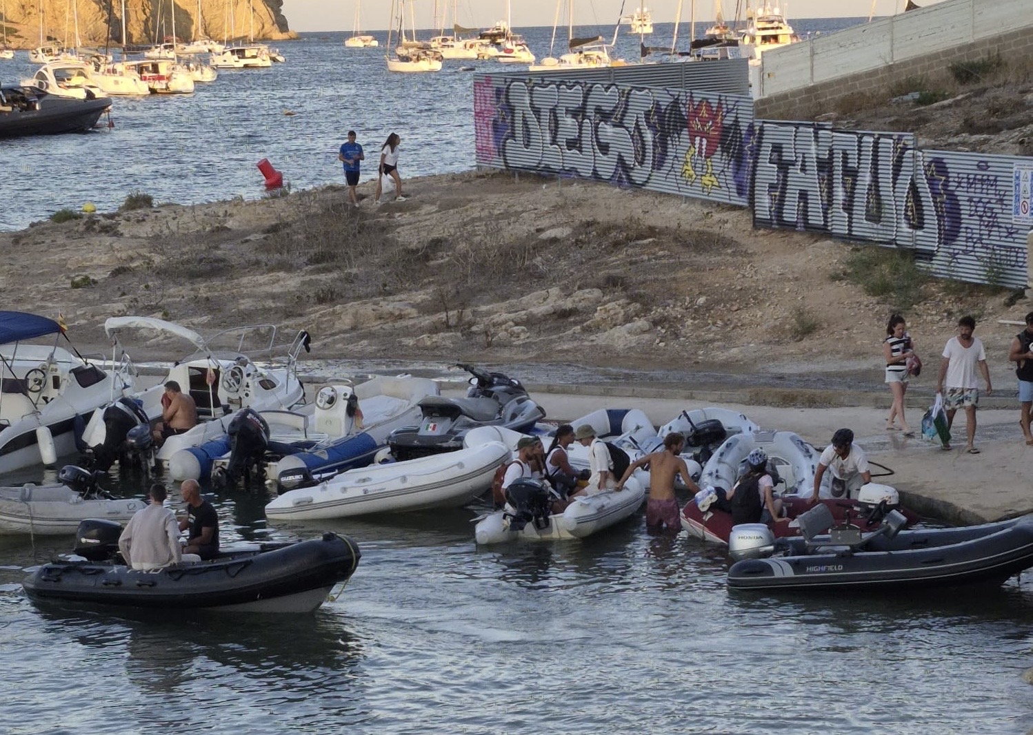 Barcas auxiliares de yates y chárters, apelotonadas ayer en el pequeño muelle de Talamanca después de que se haya cortado la baliza que puso el Consistorio para evitarlo y controlar la zona de baño. Foto de Noudiari.es