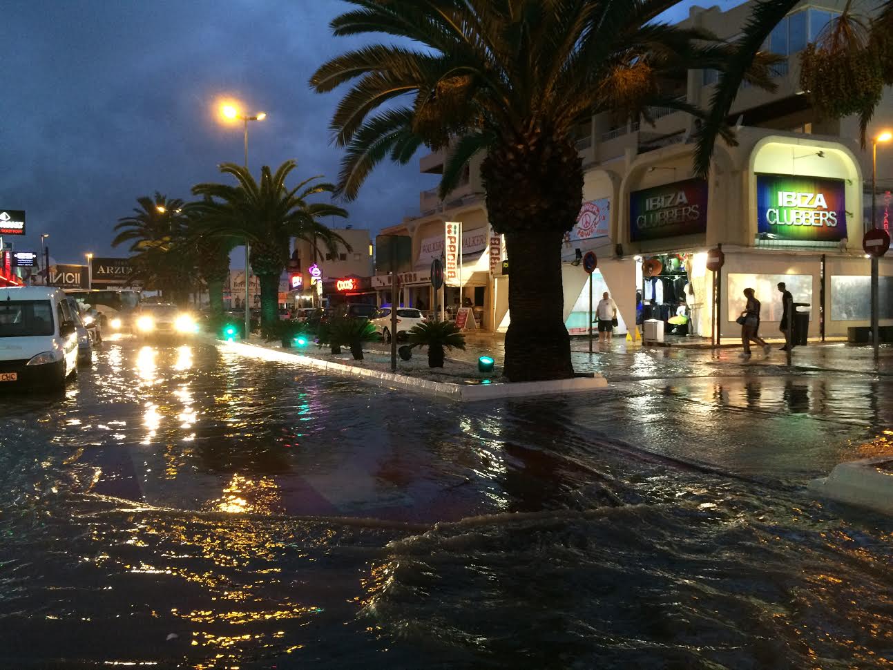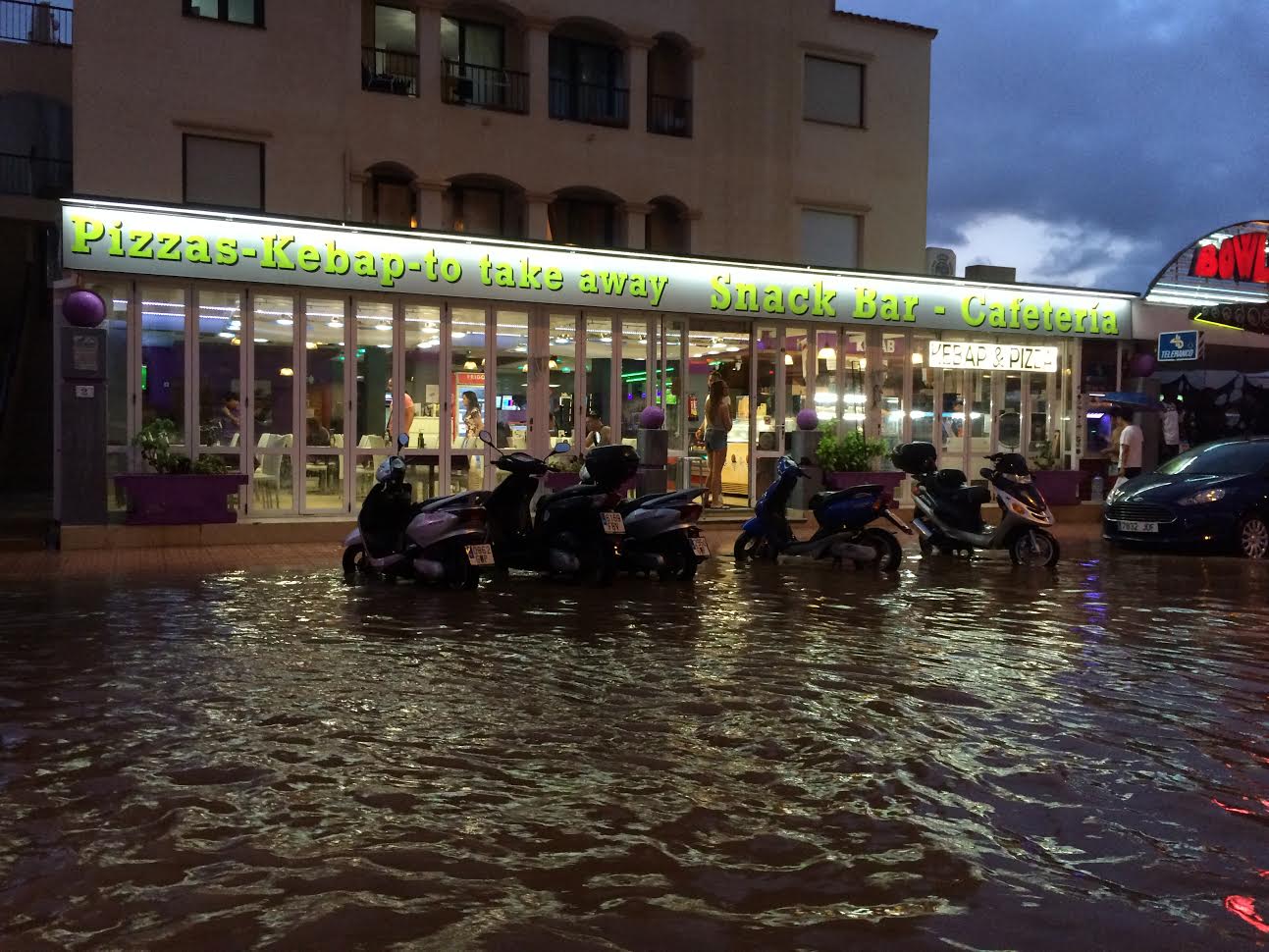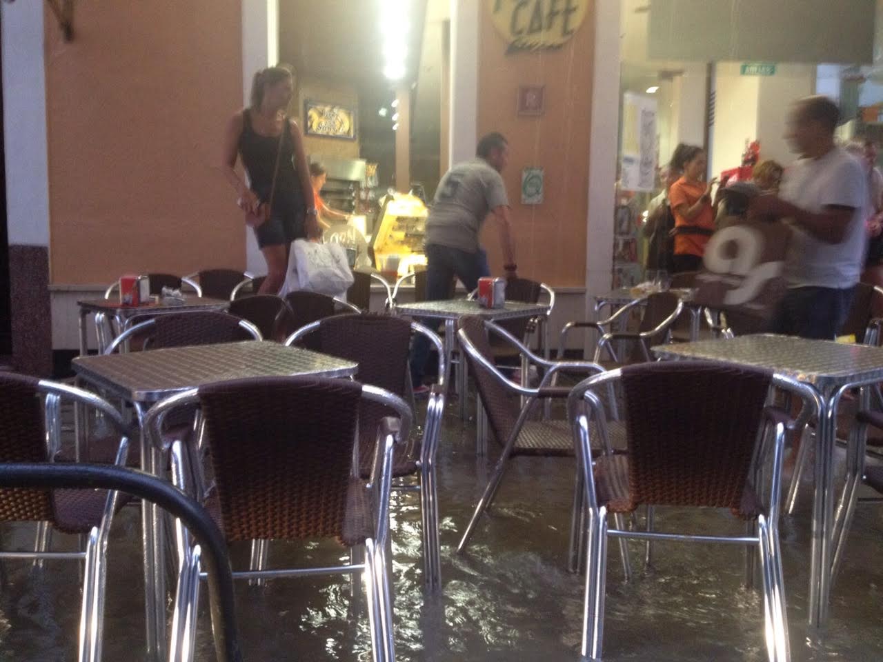 Pasadas las 19 horas, Vila se ha convertido, como ya es habitual, en un auténtico lugar caótico donde el alcantarillado no daba más de sí. Agua a nivel de los tobillos, turistas, coches y establecimientos inundados fue lo que se vivió en el centro de la ciudad.