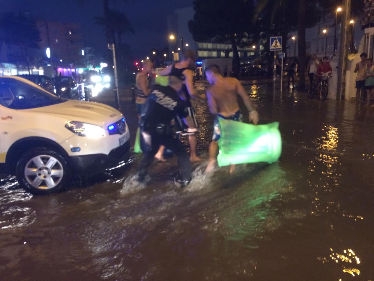 En la autovía al aeropuerto, no se vivió mejor suerte. Y tampoco en Platja d’en Bossa, donde unos turistas no dudaron en utilizar sus colchonetas veraniegas para disfrutar de la lluvia. Pero esa alegría se le fue pronto, con la llegada de la Policía Local de Sant Josep, que los desalojó de sus cómodos aposentos de malas maneras.