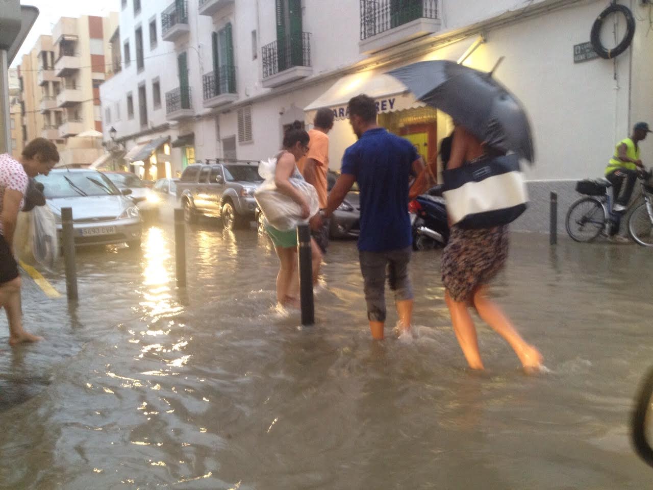 Los turistas de Platja d’en Bossa fueron testigos ayer de lo que supone una tromba de agua en la isla de Eivissa. Heces flotando, calles inundadas y un hedor insoportable fue la tónica predominante de una tarde en la isla, que se presupone es de lujo.