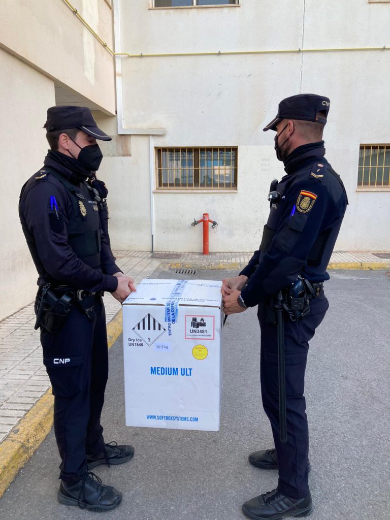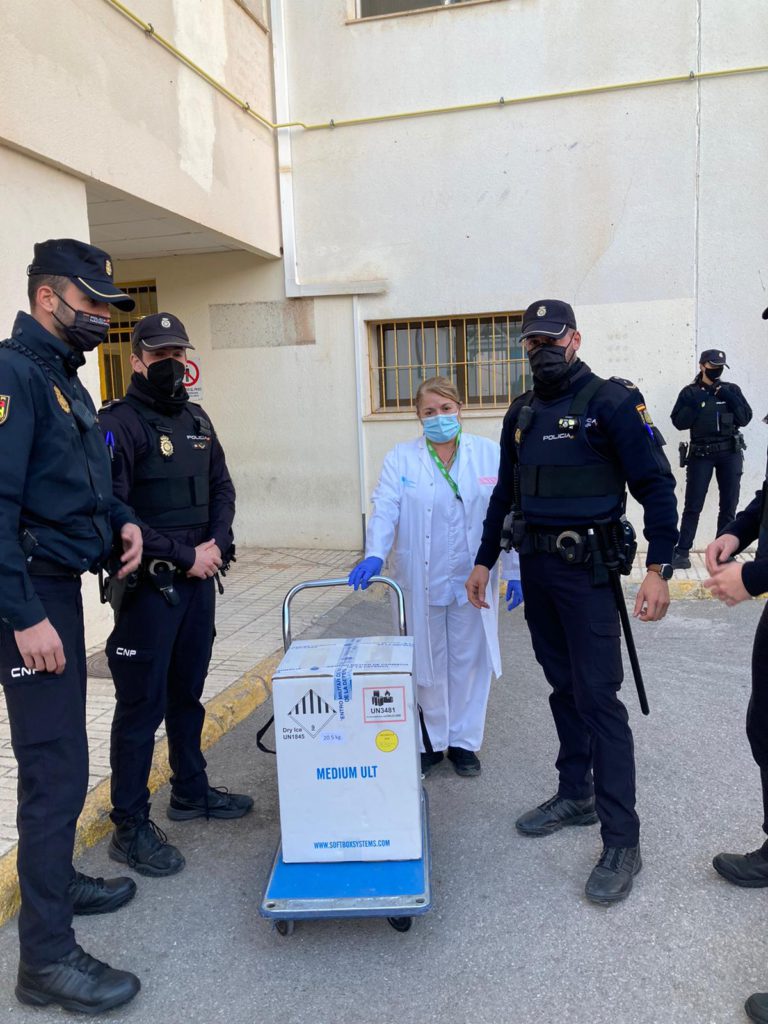 Efectivos de la Policía Nacional han custodiado la entrega y apertura en el Hospital Can Misses.