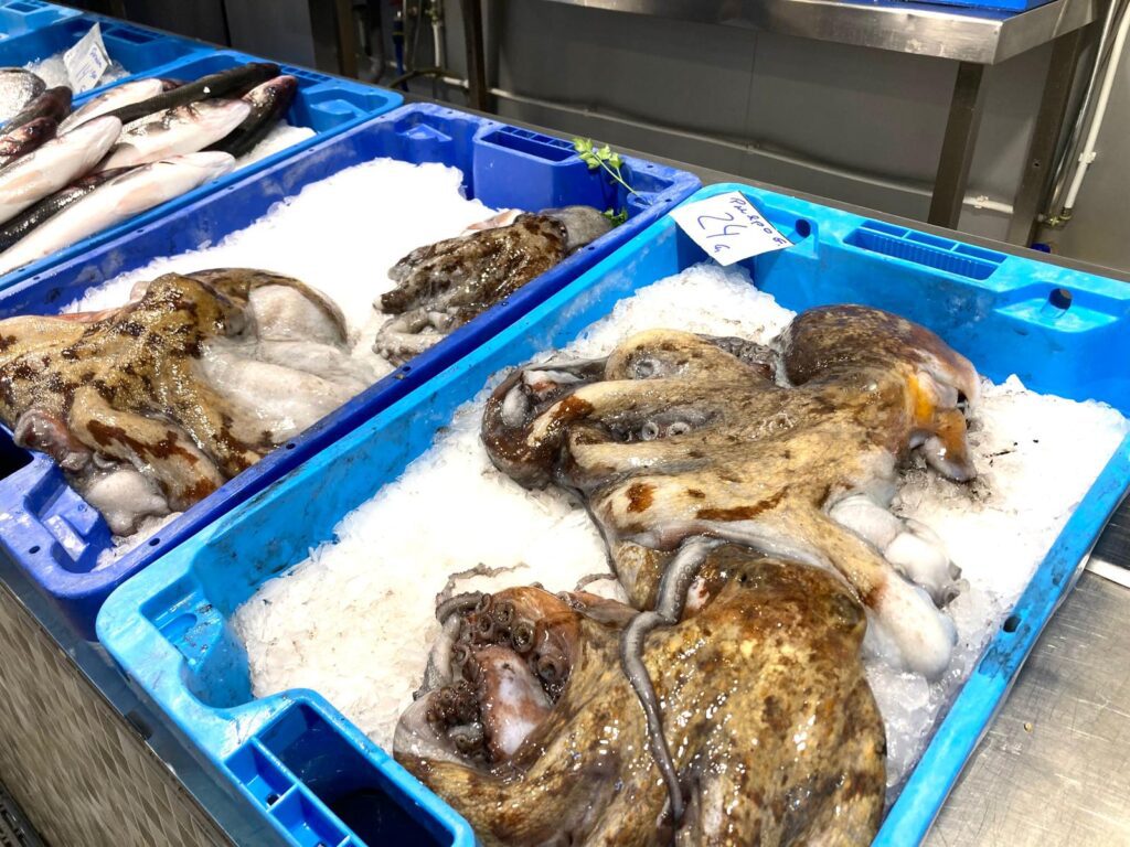 “Estos días que hemos abierto lo que está llegando de aquí es rascassa (cabracho), sepia, y alguna barca alicantina nos ha traído gamba fresca de esta zona”, explica Escandell. Sobre su mostrador, otro de los pescadores de llaüt le ha traído cinco pulpos de buen ver. Pero cinco pulpos contados, que un viernes a primera hora de la mañana vende a 24 euros el kilo. Lo habitual, cuenta la pescadera, es que el pulpo esté algo más barato, a unos 21 o 22 euros el kilo, pero entiende que los pescadores también han de hacer valer su trabajo y suban el precio.