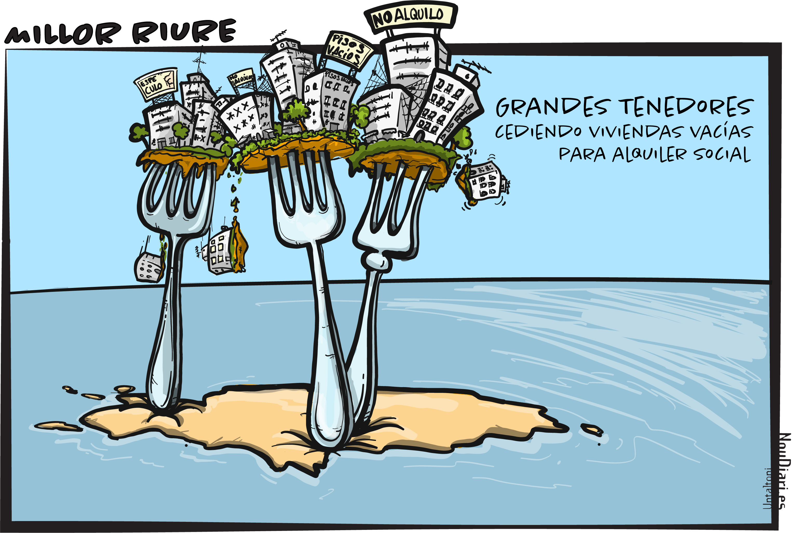 @Noudiari / Esta semana Untaltoni, en su sección ‘Millor riure’ le da una vuelta de tuerca al problema de la vivienda en Ibiza. En concreto hace referencia a la primera Ley de vivienda de Illes Balears que entró en vigor el pasado junio, que entre otras medidas recoge la de obligar a grandes ‘tenedores’ a ceder viviendas cuando haya necesidad de vivienda social.