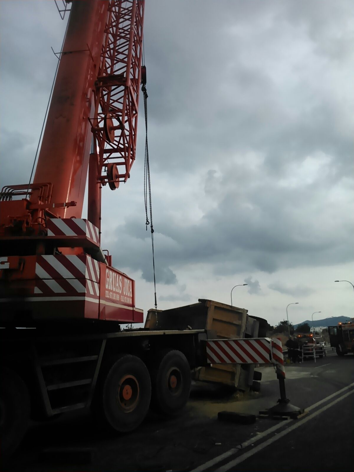 @Noudiari/ Dos grúas han sido necesarias para retirar el camión volcado este martes al mediodía en el segundo cinturón de ronda de Vila. El vehículo de gran tonelaje había quedado atravesado en la calzada interrumpiendo el tráfico durante toda la tarde en este punto de la red viaria.