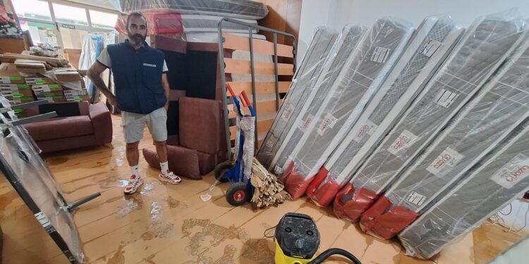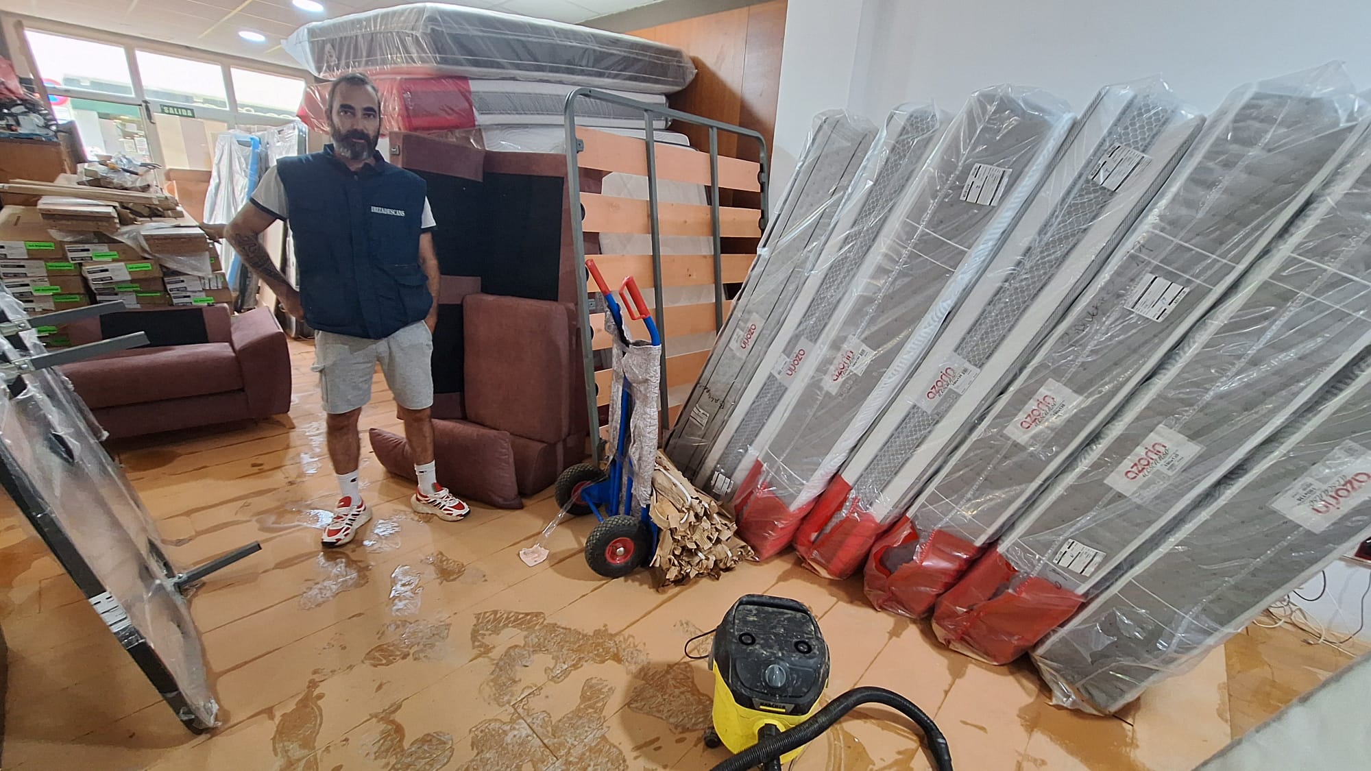 José Salazar, de IbizaDescans, posa en la trastienda de su negocio, con parte del género que echó a perder. / D.V.