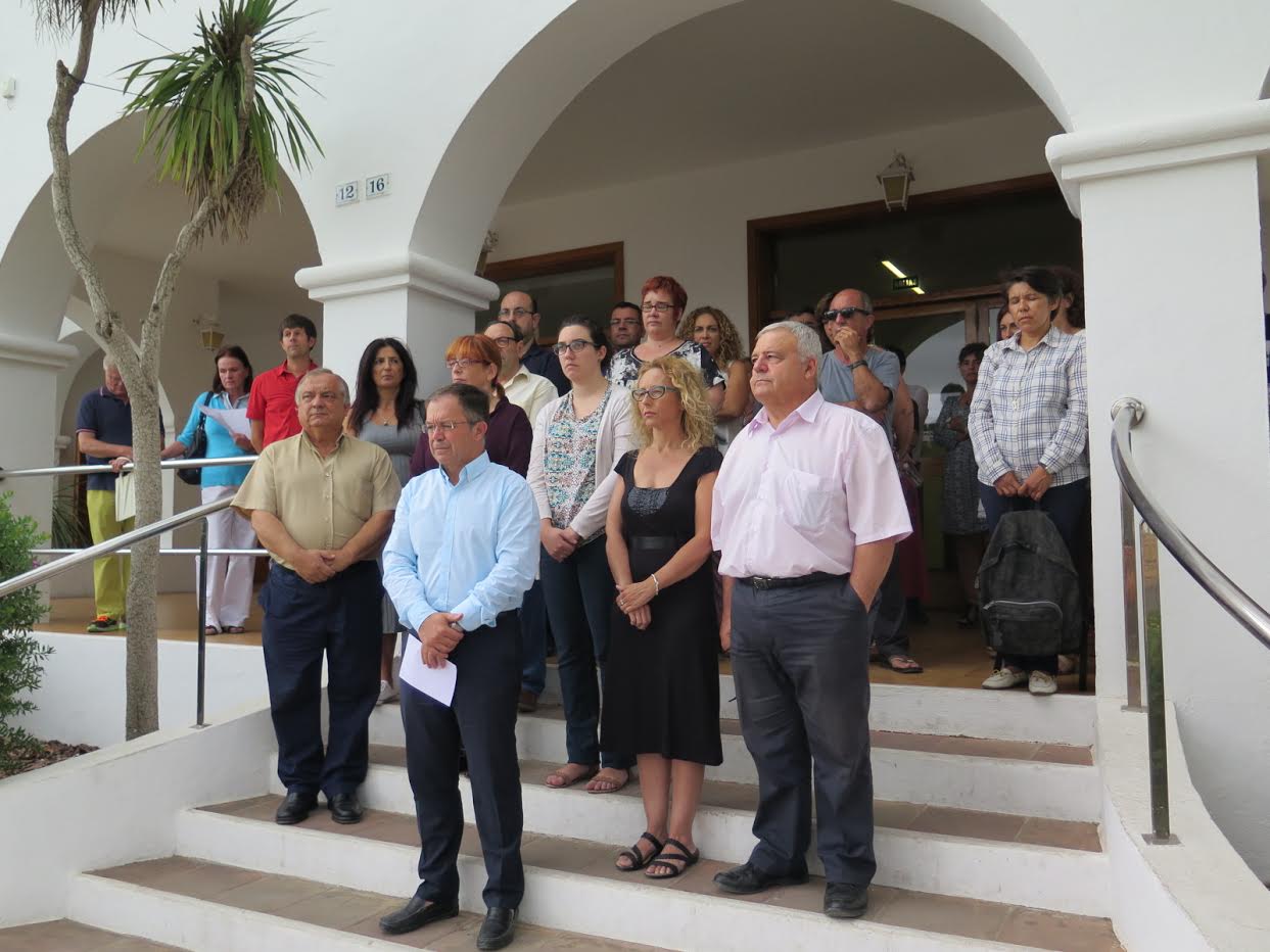 A las doce del mediodía, representantes públicos y trabajadores de la instituciones se reunieron en la puerta del Consell de Ibiza y de Can Botino.