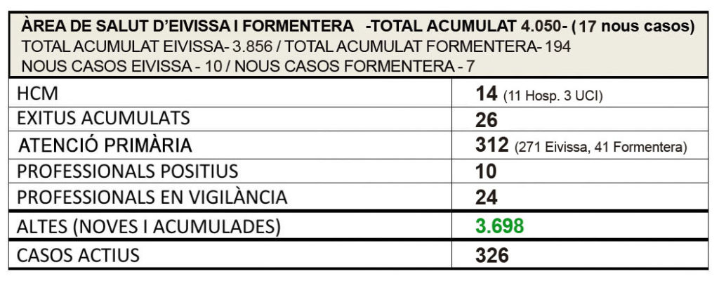 El laboratorio de Microbiología ha registrado en las últimas horas 17 nuevos positivos, 10 en Ibiza y 7 en Formentera. También en la última jornada los médicos del Área de Salud han dado 13 nuevas altas, con lo que la cifra de activos se sitúan en los 326 casos, tres más que ayer.