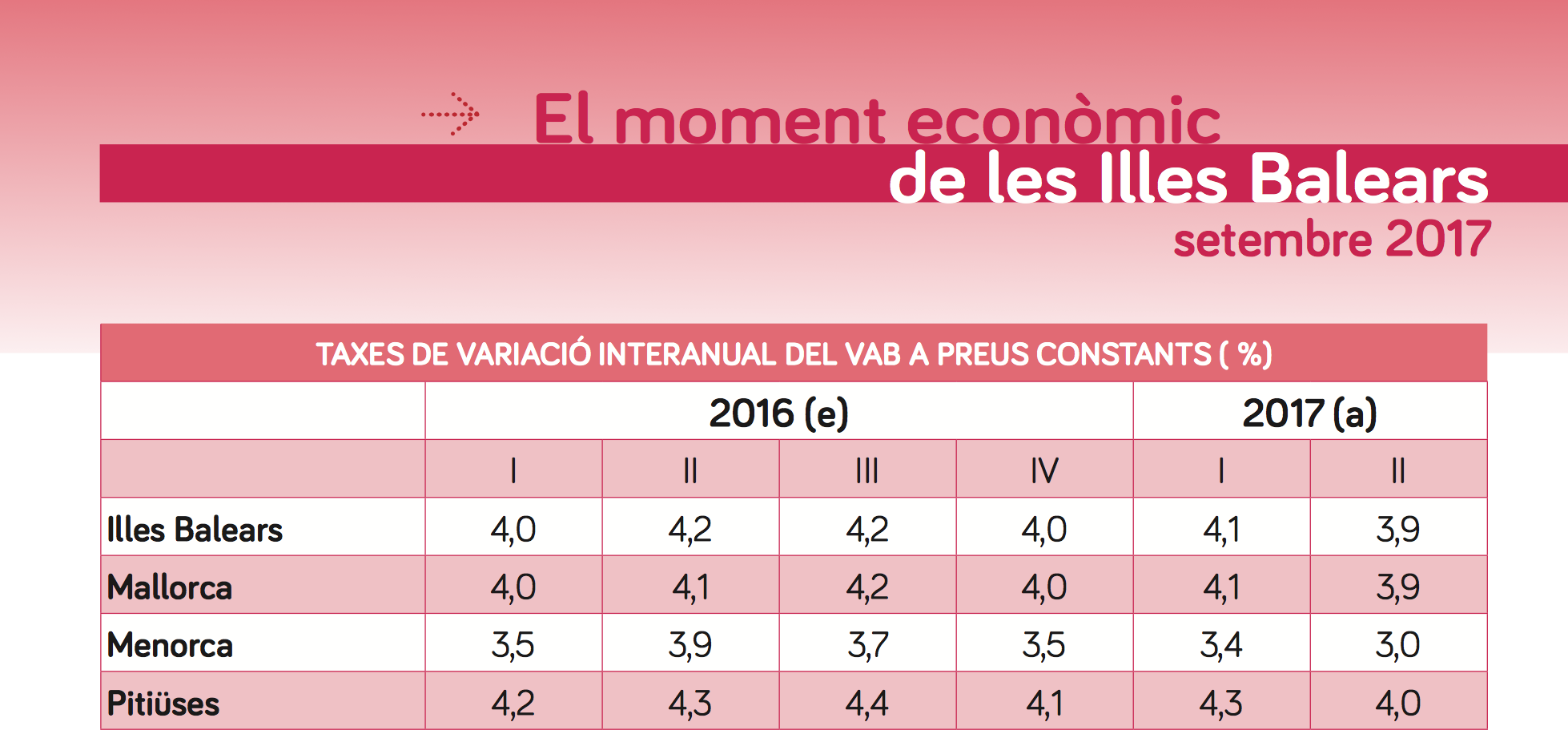Comparando el indicador por islas, las Pitiüses presentan una tasa de cuatro o más puntos en el último año y medio. Menorca, en cambio, es la región con un dinamismo más moderado, pero que aun así mantiene un crecimiento del 3,0% de variación de VAB interanual, una cifra muy por encima de la UE-28 y en el entorno de la media estatal. Mallorca crece a una tasa del 3,9%.