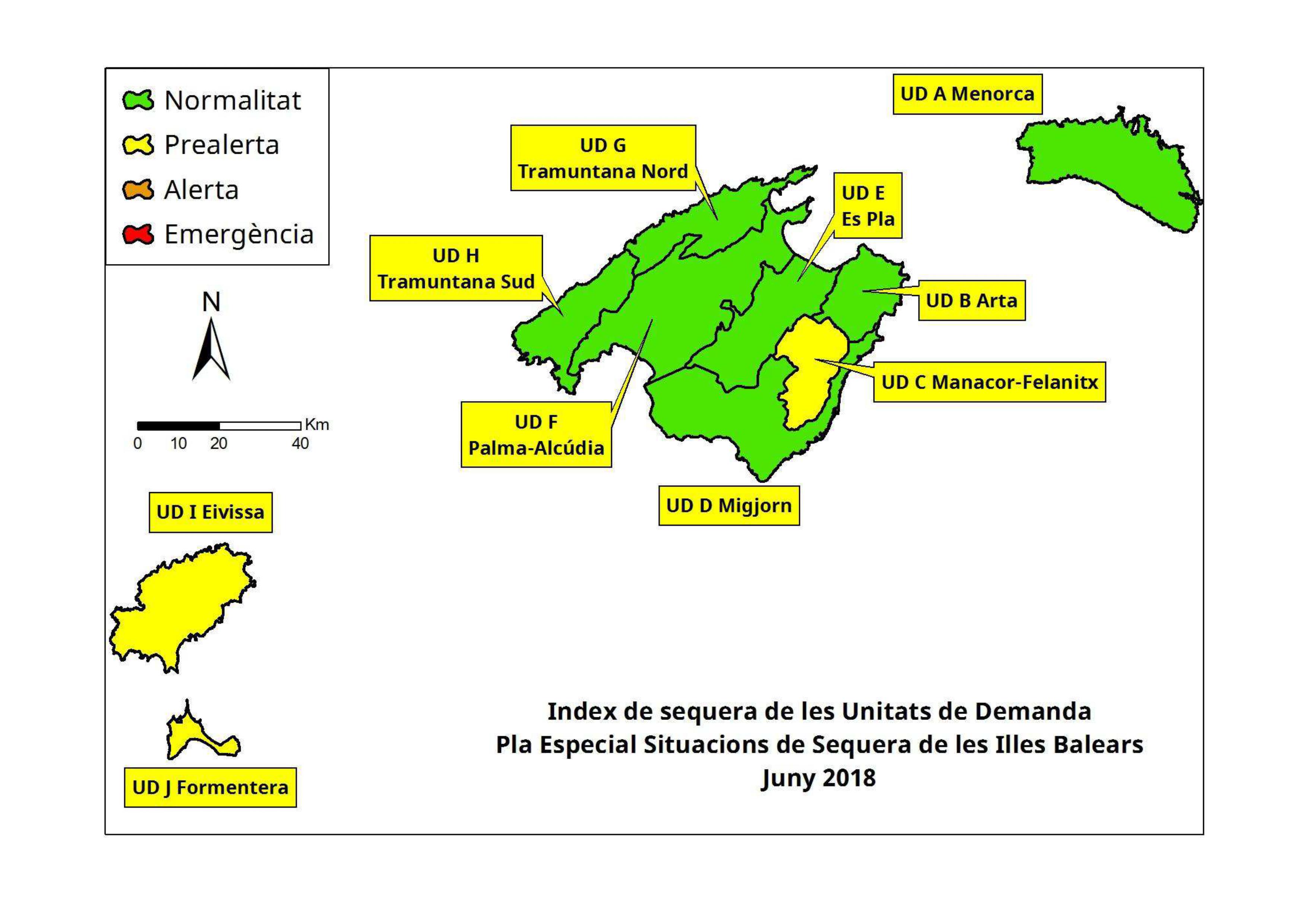 Dadas las lluvias de junio, que el mes de julio suele ser seco y con consumos elevados, se prevé que las unidades de demanda de Menorca y Tramuntana Sur puedan entrar en situación de prealerta el próximo mes y se mantendría en Manacor, Eivissa y Formentera.
