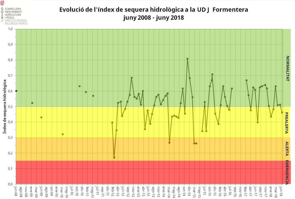 En cuanto al índice de sequía, hay un descenso generalizado en todas las unidades, de las cuales los más significativos son en Artà, en el Pla y en Tramuntanta Norte y Sur. Aun así, todas las unidades continúan en escenario de normalidad, aunque el índice muestra valores de prealerta en las unidades de demanda de Manacor-Felanitx, Eivissa y Formentera.