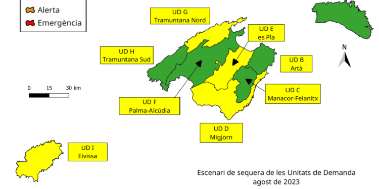 En el último mes, ocho Unidades de Demanda (en las que se organizan las islas para evaluar su situación hídrica) bajan: Menorca, Artà, Manacor-Felanitx, Migjorn, Pla, Palma-Alcúdia, Tramuntana Nord, Tramuntana Sud; y dos suben: Eivissa y Formentera.