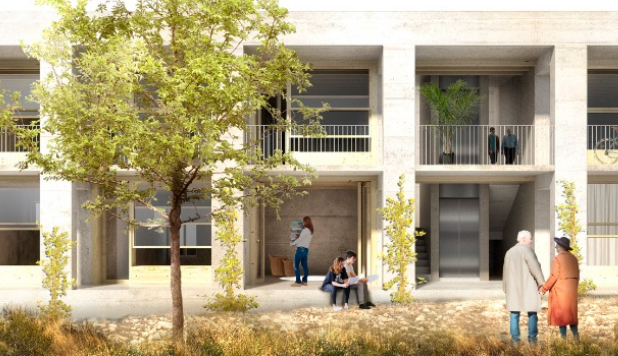 La nueva promoción, sigue con las técnicas de arquitectura sostenible impulsadas por el IBAVI, con la utilización de materiales de km0 y con una reducción muy importante de emisiones tanto en el proceso constructivo como en la vida útil de la vivienda. Así pues, la estrategia principal del proyecto consiste en la construcción de unos muros de carga paralelos hechos con hormigón de cal, que incorporan el árido reciclado de la excavación y del vertedero.
