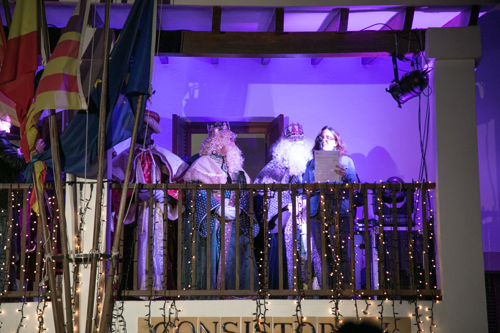 Una vez saludados, sus majestades de Oriente ocuparon cada uno una carroza de las seis engalanadas para la ocasión por los miembros de la Associació Reis Mags y que lucían en todo su esplendor, mientras una lluvia de caramelos caía sobre los asistentes. La caravana comenzó su recorrido pasadas las 18.00 horas hacia la plaza de Sant Francesc, donde otro nutrido grupo de pequeños los esperaban.