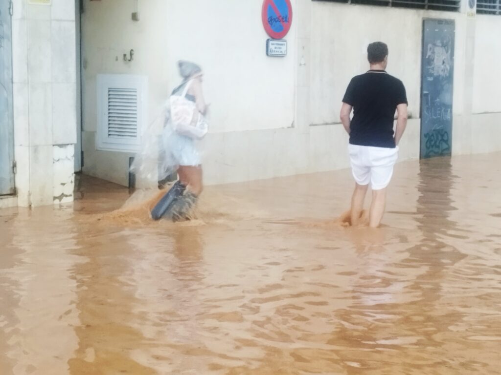 En la avenida Ignasi Wallis, uno de los puntos más afectados, el agua cubría hasta las rodillas de los viandantes. Varios vehículos han quedado parados en mitad de la vía por averías causadas por el agua.