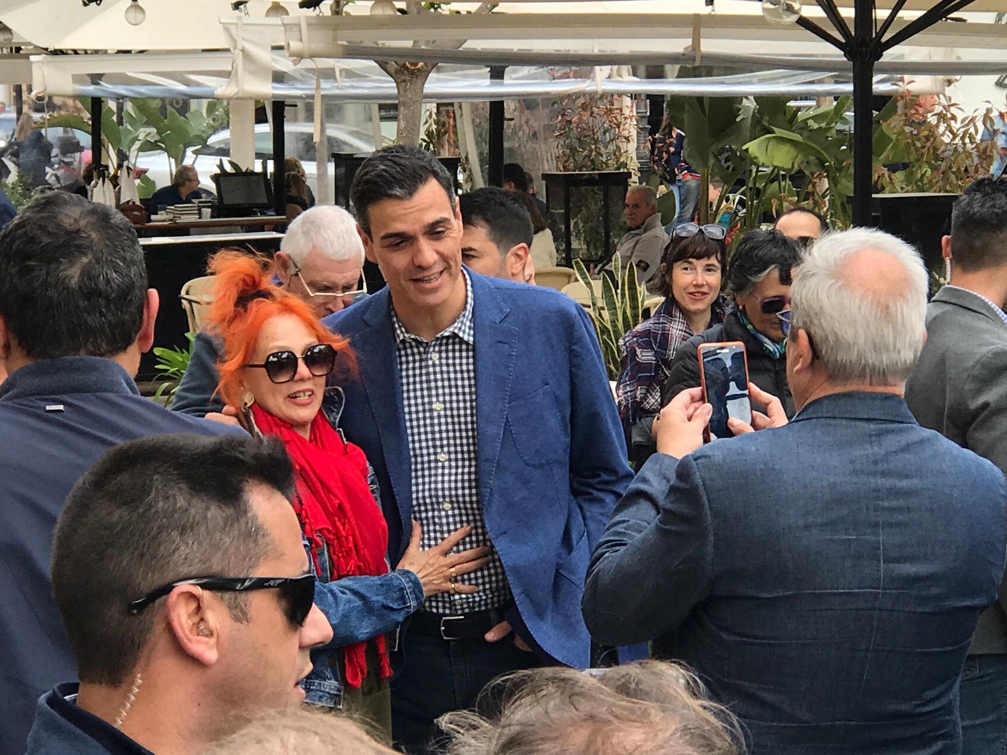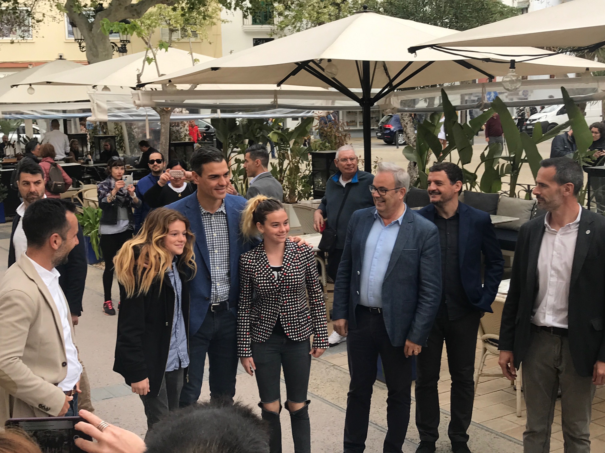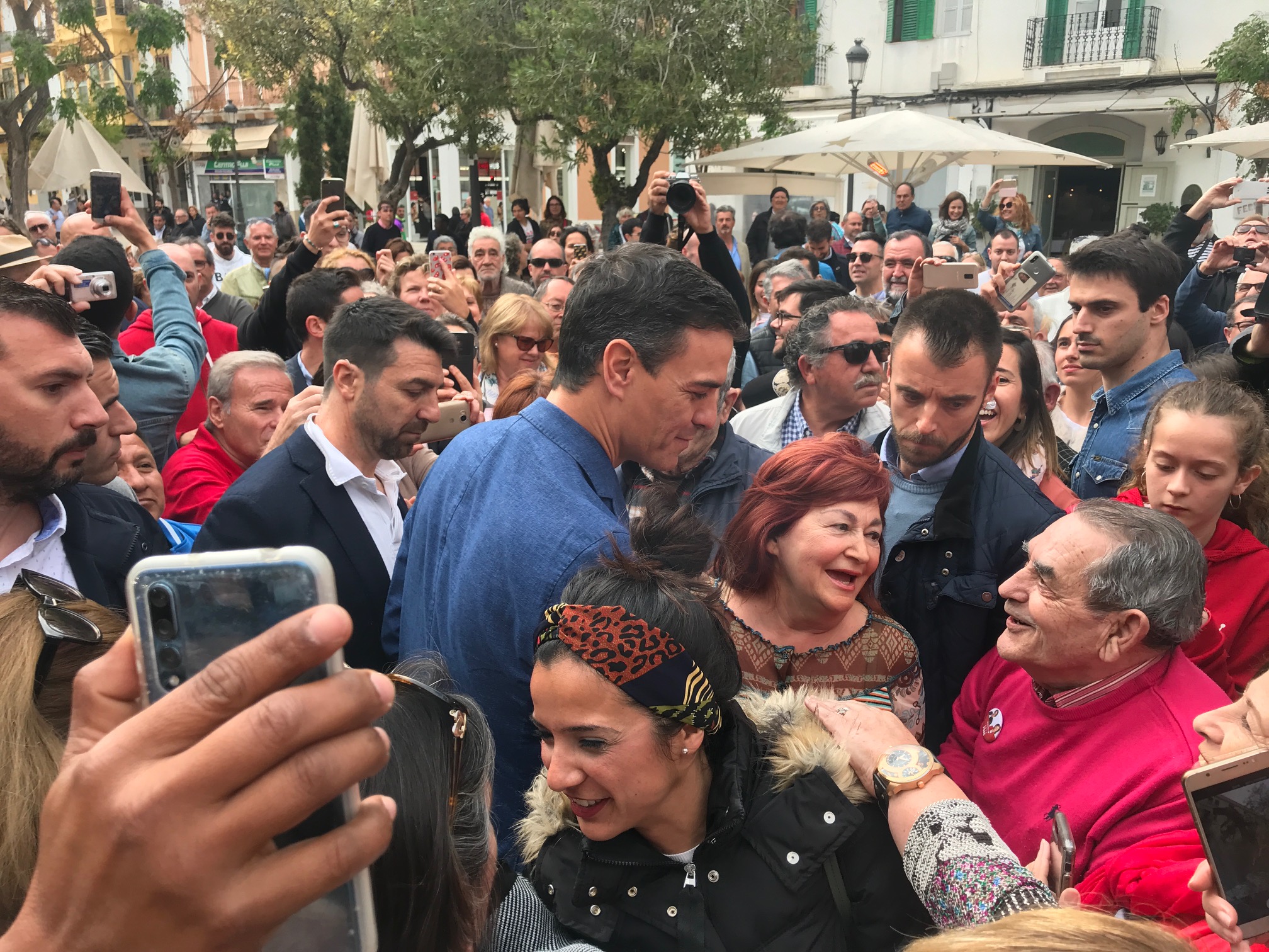 Sánchez ha saludado a sus simpatizantes y a los compañeros de partido, con su férrea amiga Sofía Hernanz y Patricia Abascal, candidatas al Congreso y al Senado, y el resto de alcaldables socialistas de la isla y el presidente del Consell, Vicent Torres, entre ellos. El paseíllo ha comenzado frente al Montesol y ha finalizado 18:04 horas en la calle d’Avicenna, donde ha subido a un Nissan Qashqai negro metalizado para poner rumbo a Mallorca, donde tenía previsto un mitin a las 19 horas.