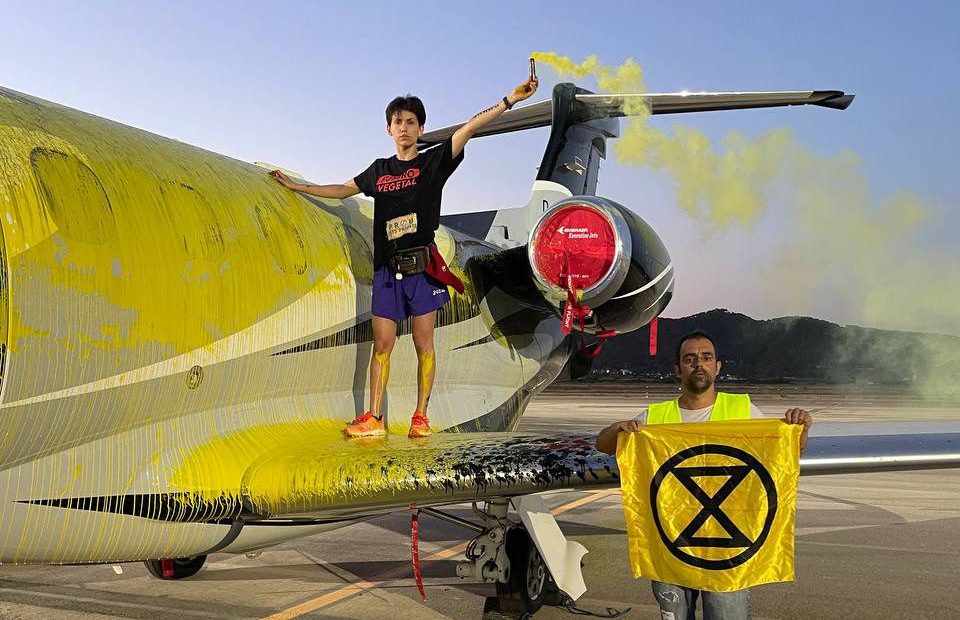 Los detenidos son tres hombres y una mujer de nacionalidad española que en torno a las 6.00 horas rociaron con pintura un jet privado y se han pegado al aparato para protestar contra la inacción de las instituciones ante la crisis climática y reclamar cambios en el sistema agroalimentario.