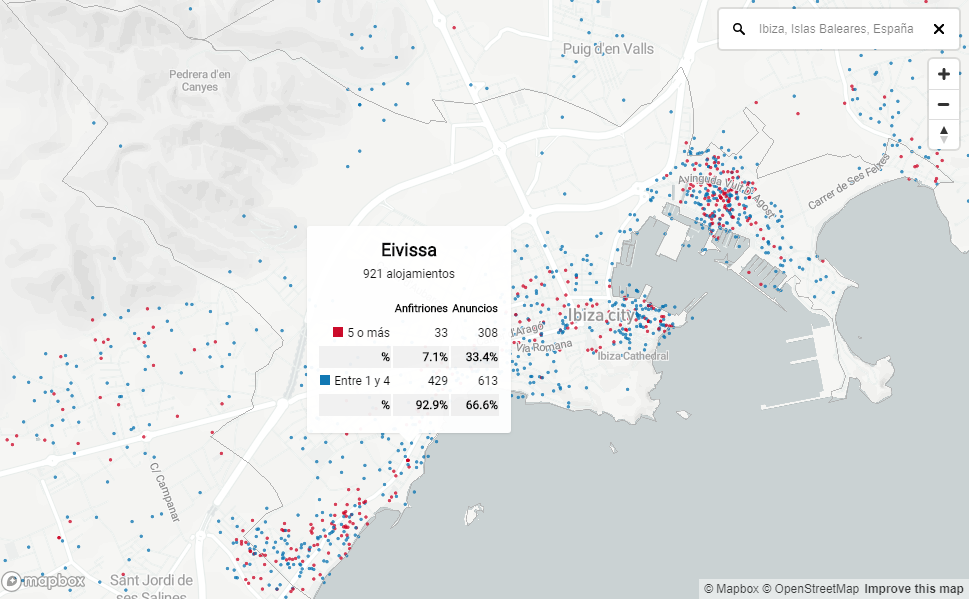 De los 1.213 anuncios ofertados en Sant Josep, el 31,7 % está gestionado por ‘anfitriones’ con más de cinco pisos cada uno. El municipio de Eivissa oferta unos 921 alojamientos de los cuales el 33,4% está gestionado por titulares de 5 o más inmuebles.