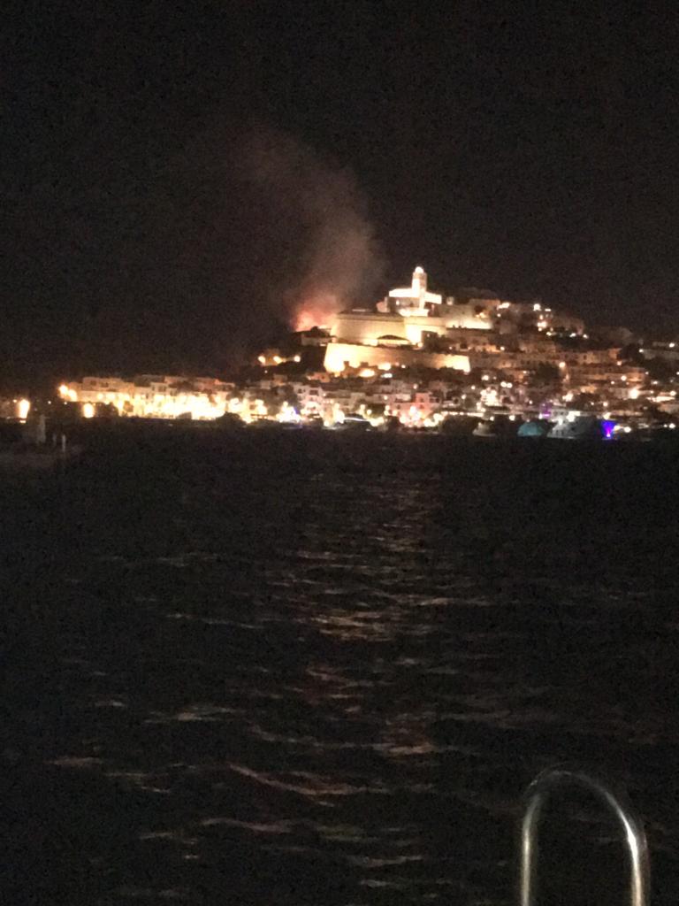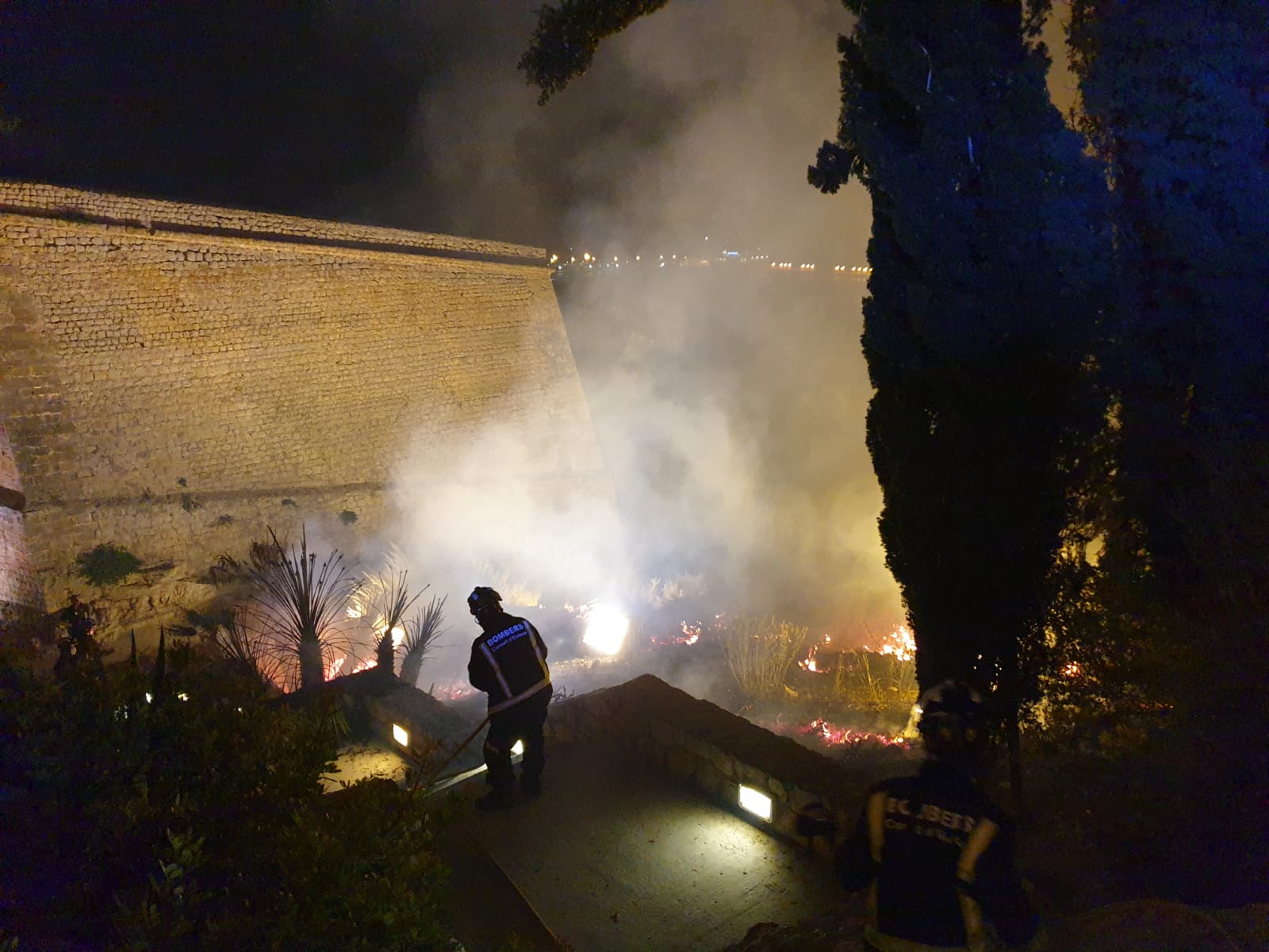 @Noudiari / Los bomberos han tenido que intervenir en un incendio declarado poco después de las diez y media de esta noche junto al aparcamiento de es Soto Fosc de Dalt Vila. Las llamas han afectado a la vegetación reinante en la zona, principalmente rastrojos, y no han alcanzado a ningún vehículo.