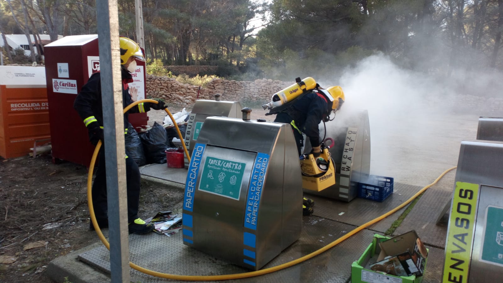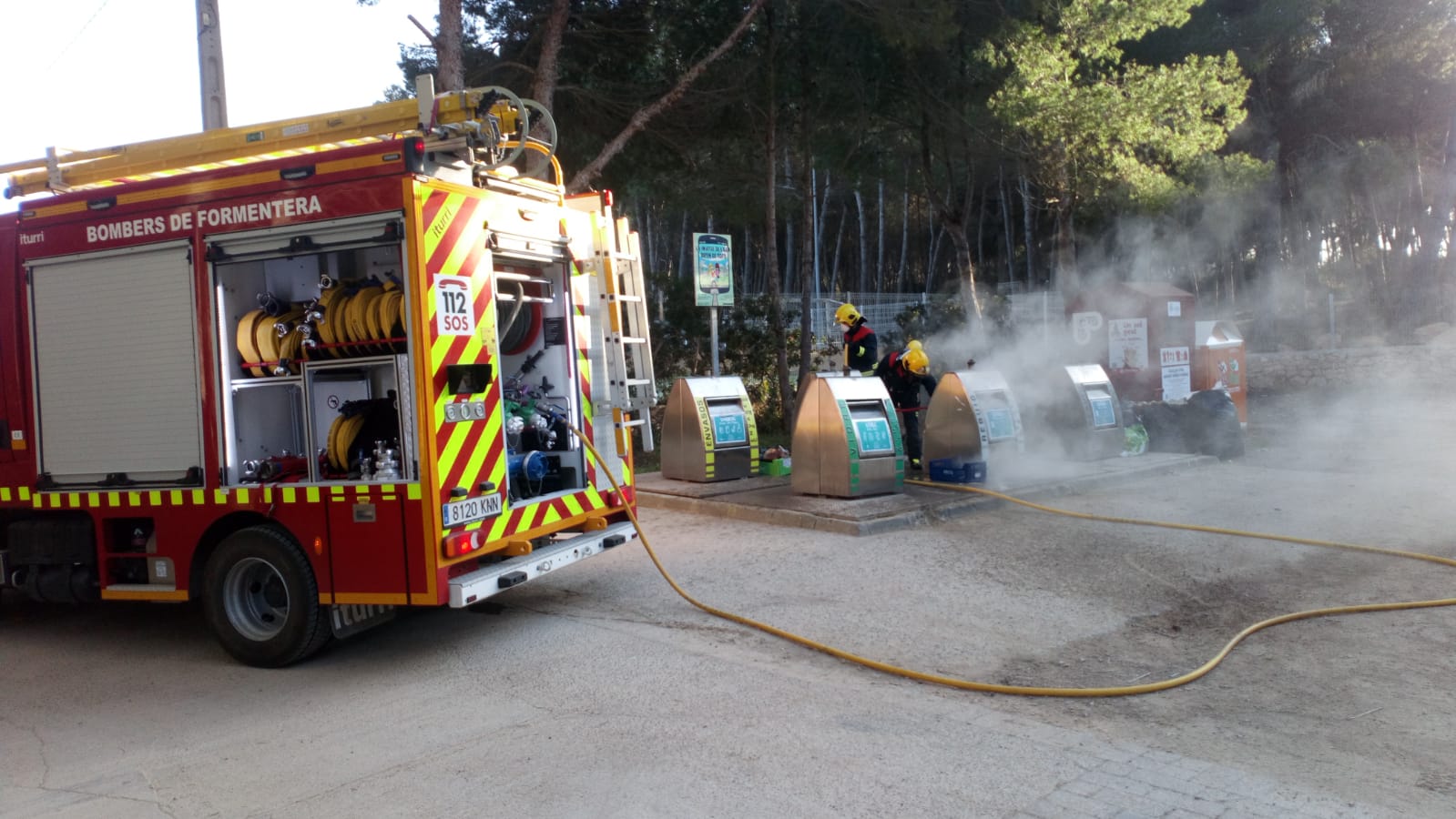 @Noudiari / Efectivos del Parque insular de Bomberos de Formentera han sofocado este viernes un incendio declarado en unos contenedores soterrados en la población de el Pilar de la Mola.
