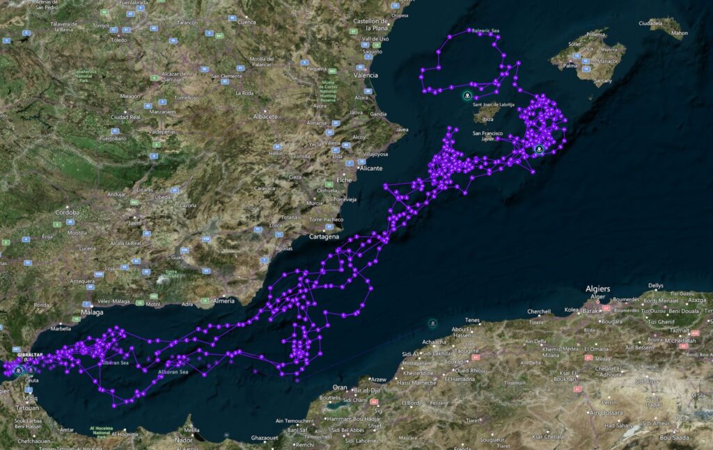 “Lo que sabemos seguro es que en el Estrecho tenemos constancia de animales a lo largo de todo el año, menos en verano. Vemos que están unos días en el Estrecho, luego se mueven, se quedan en un seco [relieve submarino] enfrente de Málaga, luego enfrente de Orán, luego hacia Cabo de Gata… y acaban llegando a las Pitiusas, donde tiene que haber unos secos muy importantes para calamares porque se quedan por allí mucho tiempo”.
