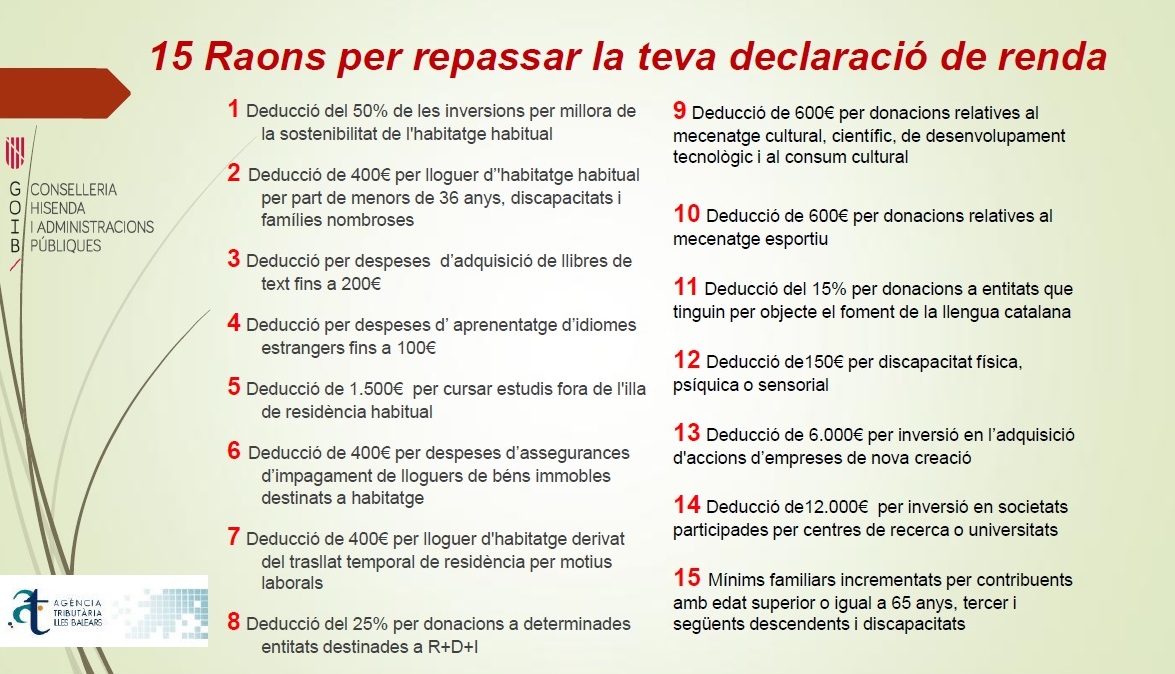 Los contribuyentes de Balears se pueden beneficiar de 15 deducciones en el tramo autonómico del IRPF en la renta de 2017