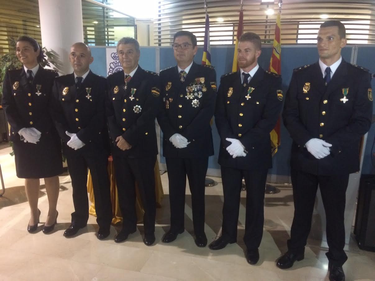 Los agentes de la Policía Nacional que han recibido la cruz al mérito con distintivo blanco junto al comiario, José Luis Garau.