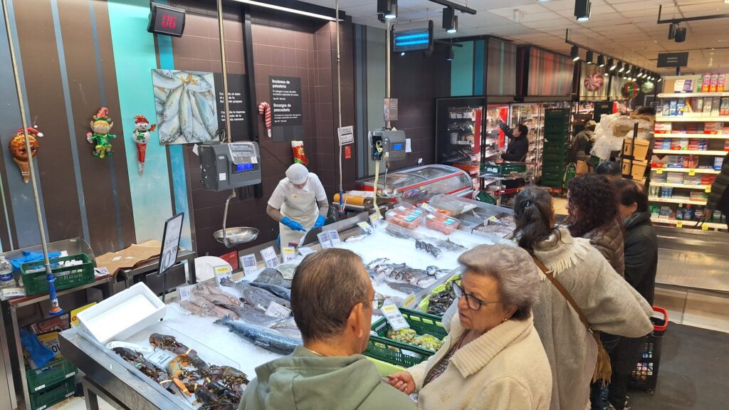 Las aglomeraciones no son exclusivas del Mercat Nou de Vila. En el Eroski de la calle Abad y Lasierra, también en Ibiza, hay largas colas en las cajas. En la pescadería, un cliente, Pablo García, explica que ha venido a comprar gambones, que los ha visto bien de precio. “En la cena del 24 seremos unos 20 y ya nos hemos organizado. Cada uno compra una cosa distinta”, y calcula que por estas fechas, solo en comida y bebida, se gastará unos 300 euros.