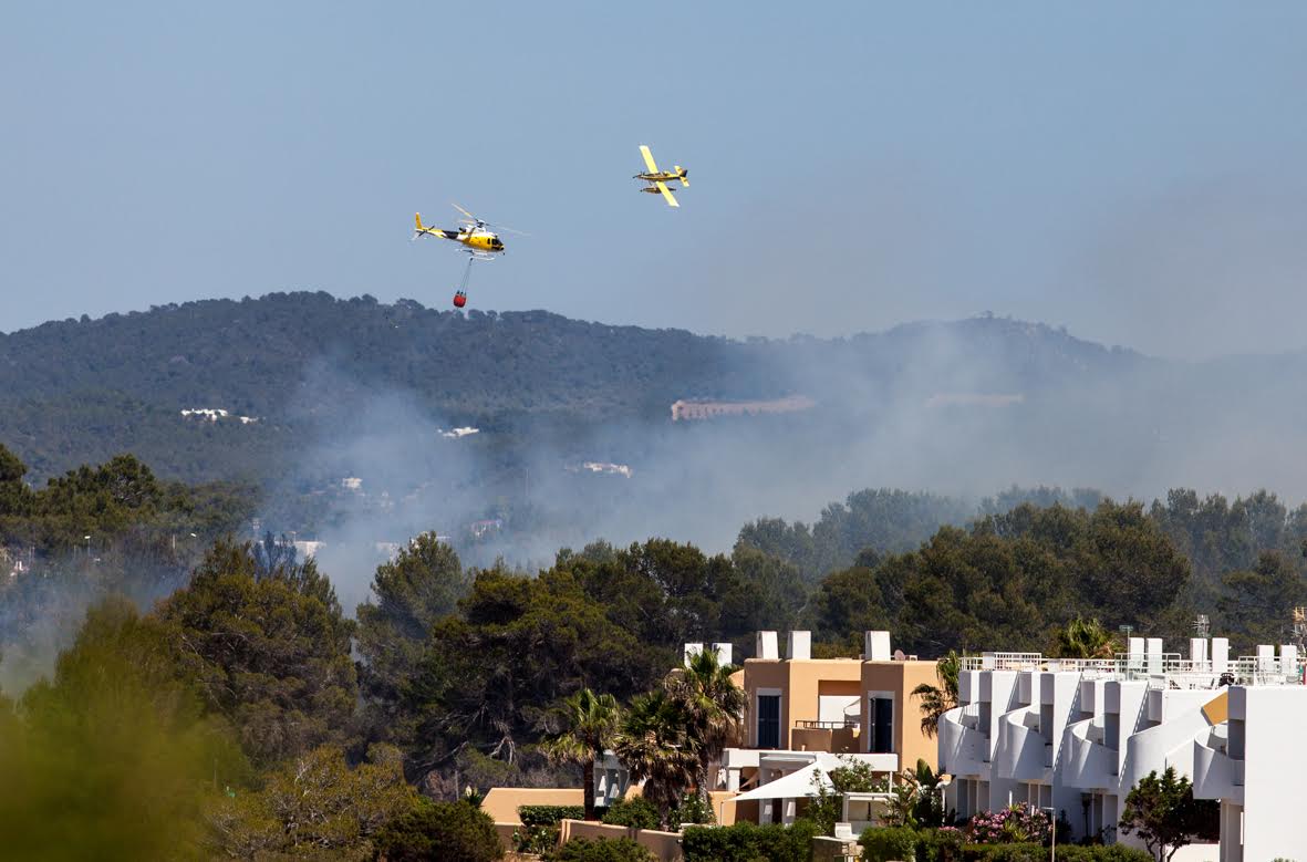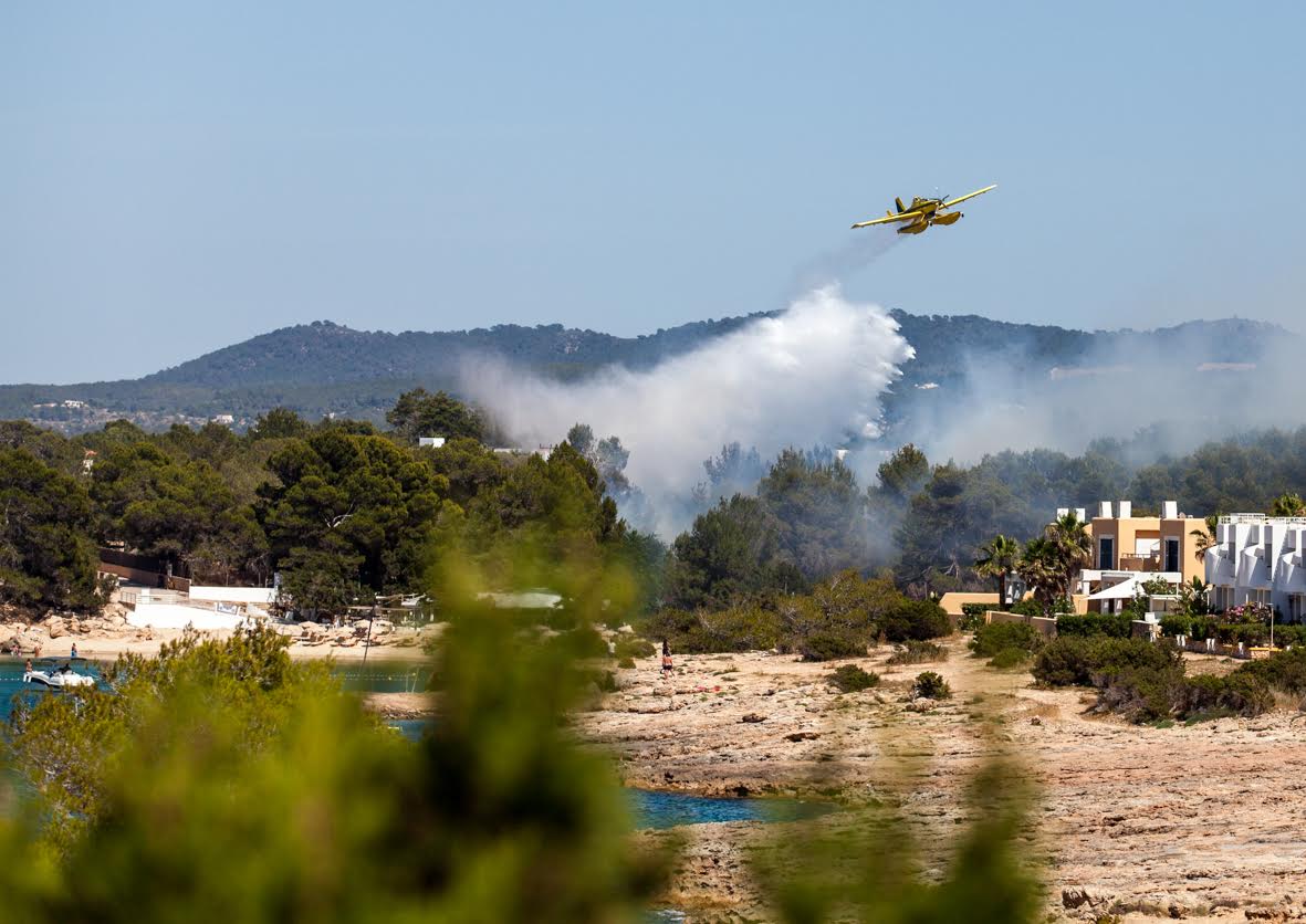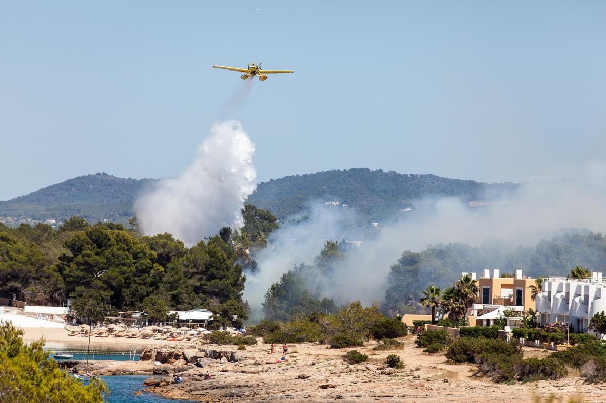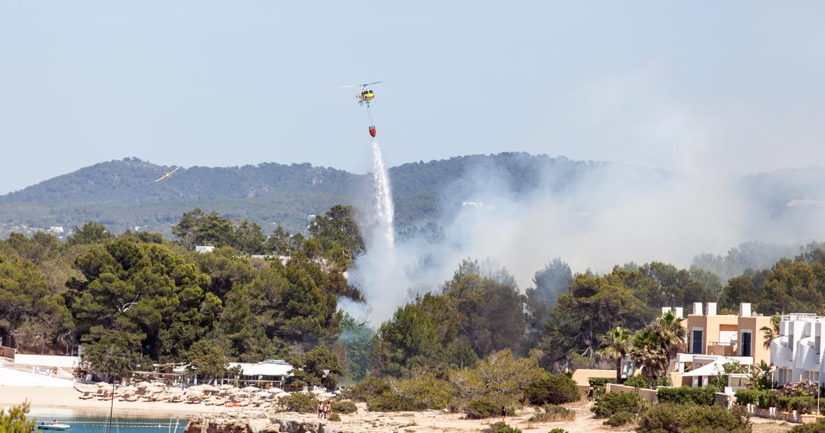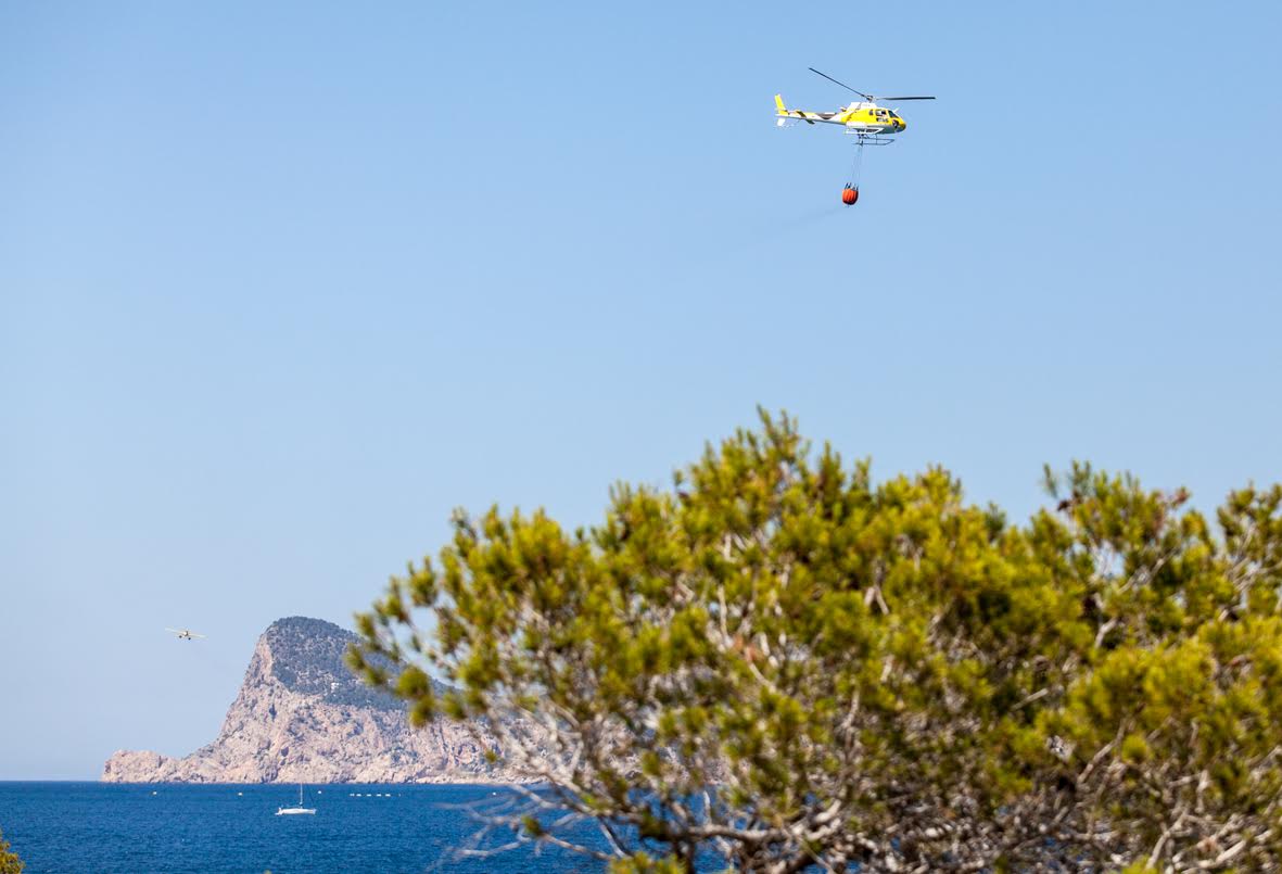 Tres aviones, tres helicópteros, dos autobombas, cuatro brigadas, cinco agentes de Medio Ambiente y dos técnicos están actuando en la zona, junto a los efectivos de los Bomberos de Ibiza.