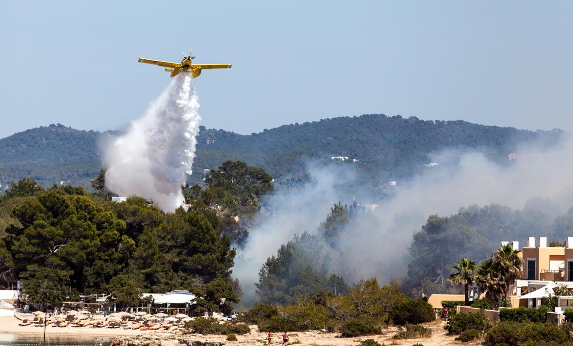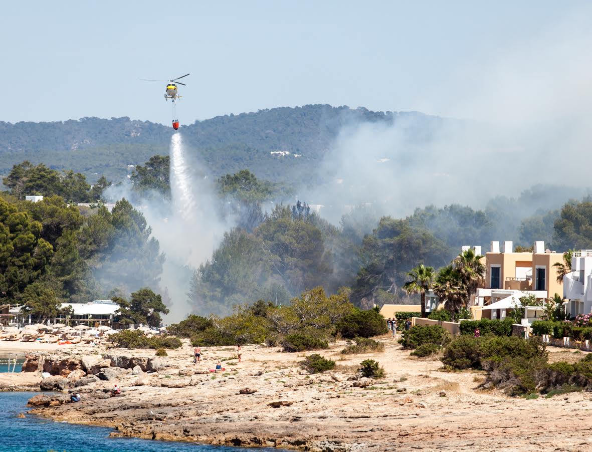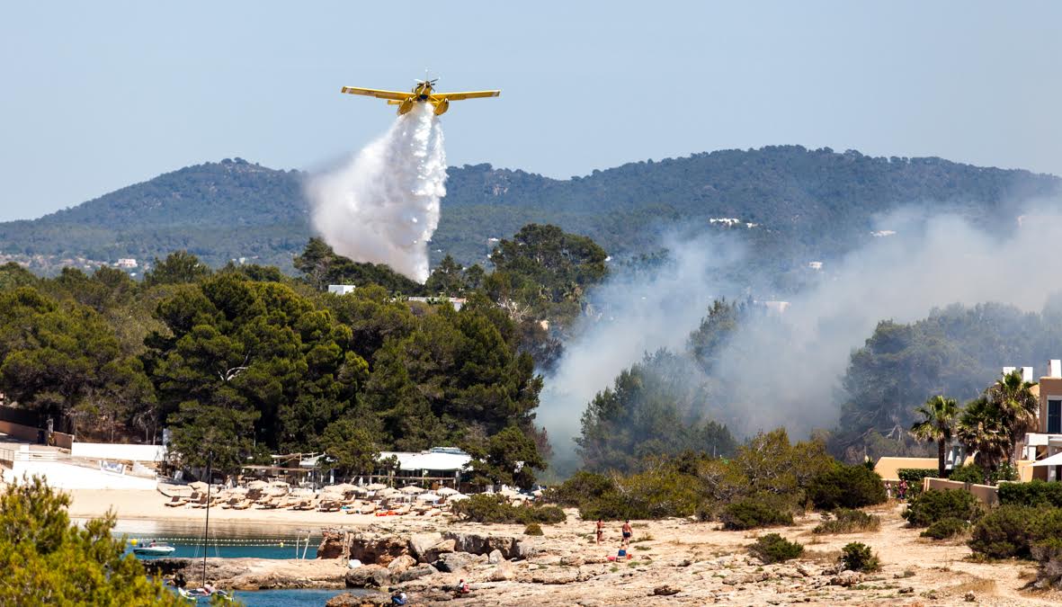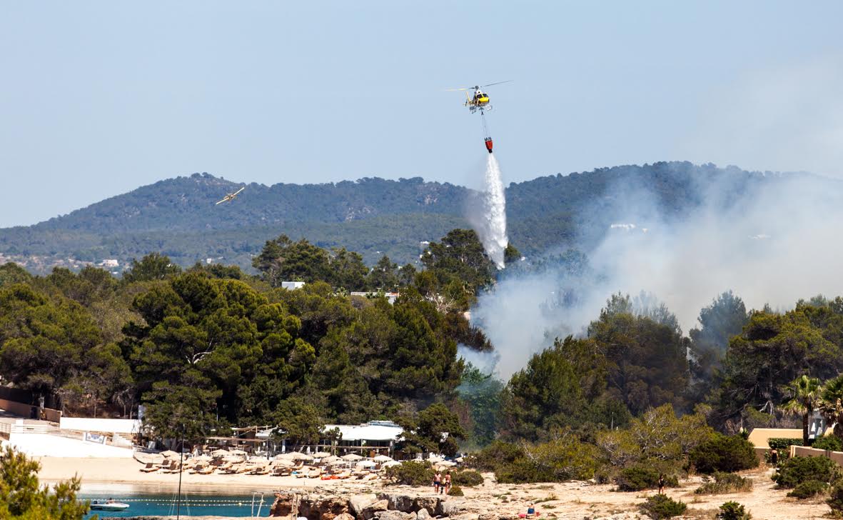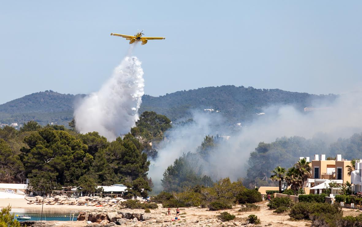 Tres aviones, tres helicópteros, dos autobombas, cuatro brigadas, cinco agentes de Medio Ambiente y dos técnicos están actuando en la zona, junto a los efectivos de los Bomberos de Ibiza.