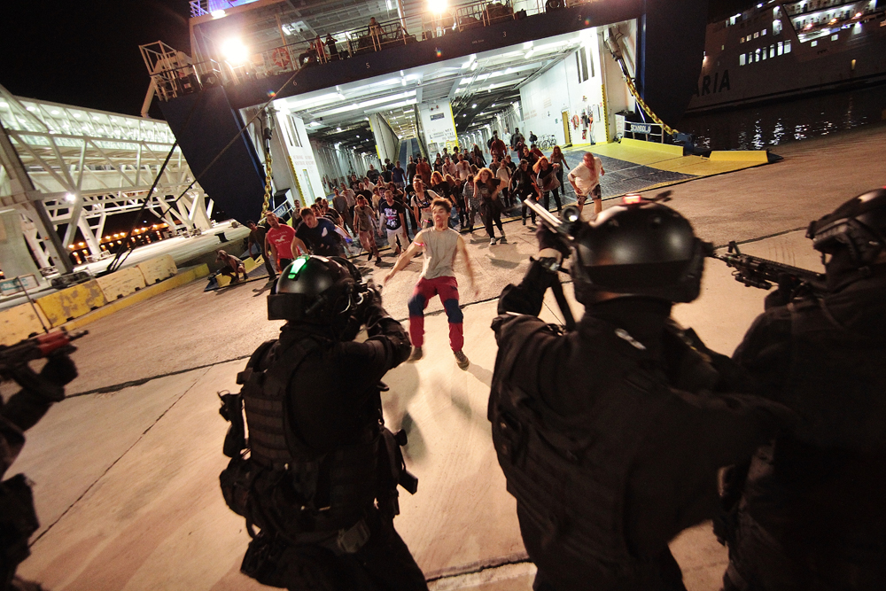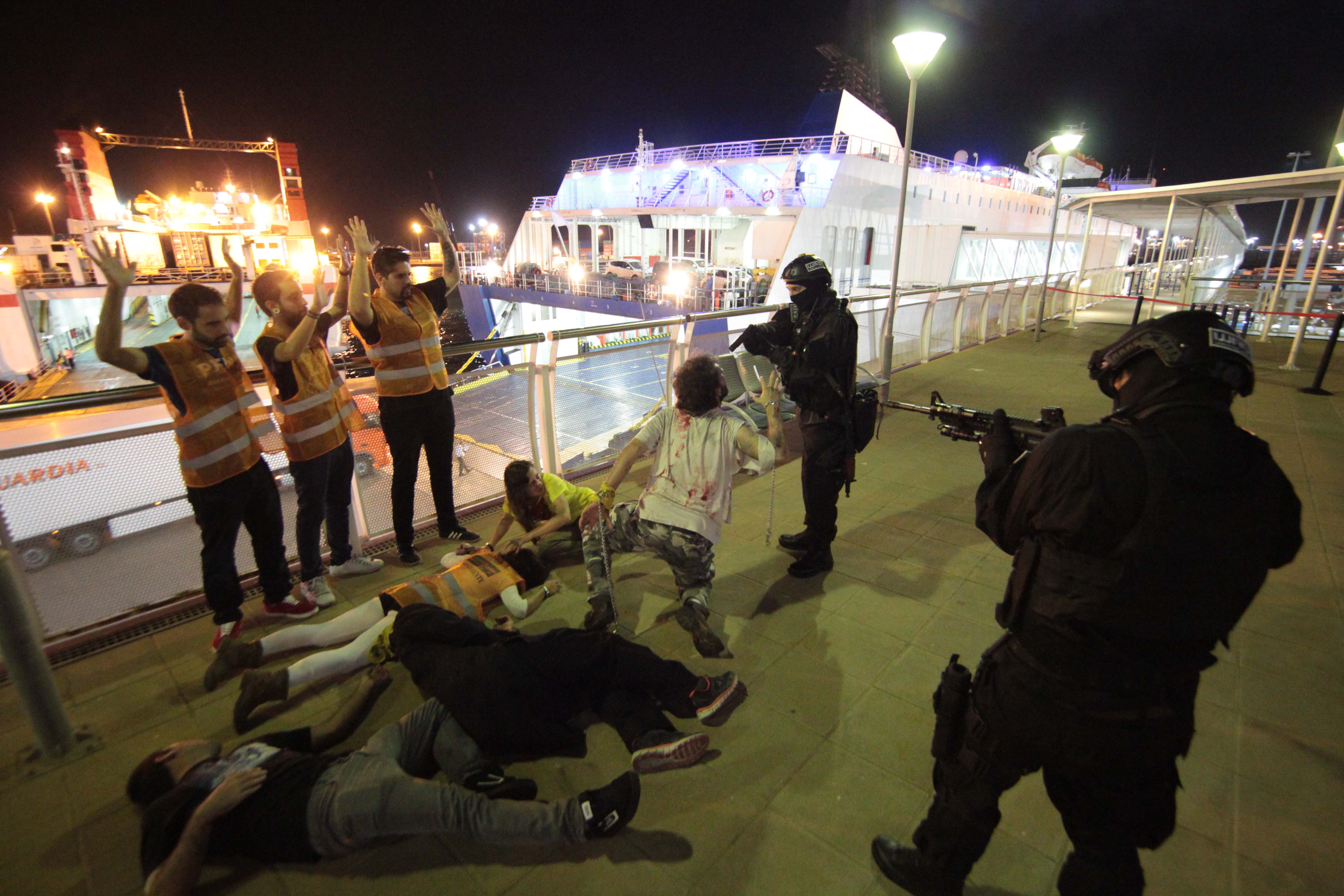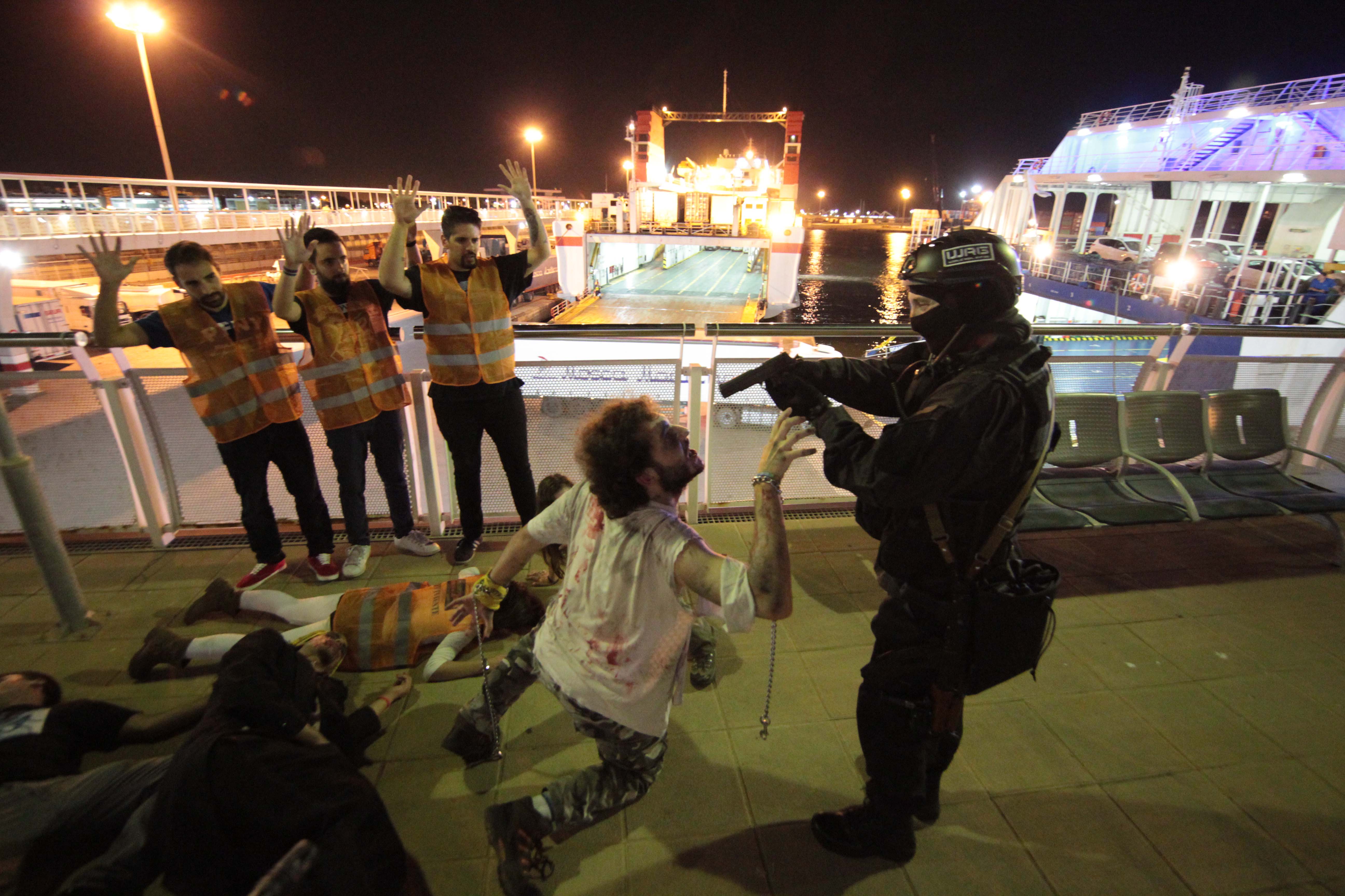Al término del juego, «han sobrevivido» menos de 100 participantes, que han desembarcado escudados por las «fuerzas de seguridad» al puerto de Eivissa, donde han escenificado un final apoteósico de la Survival Zombie.