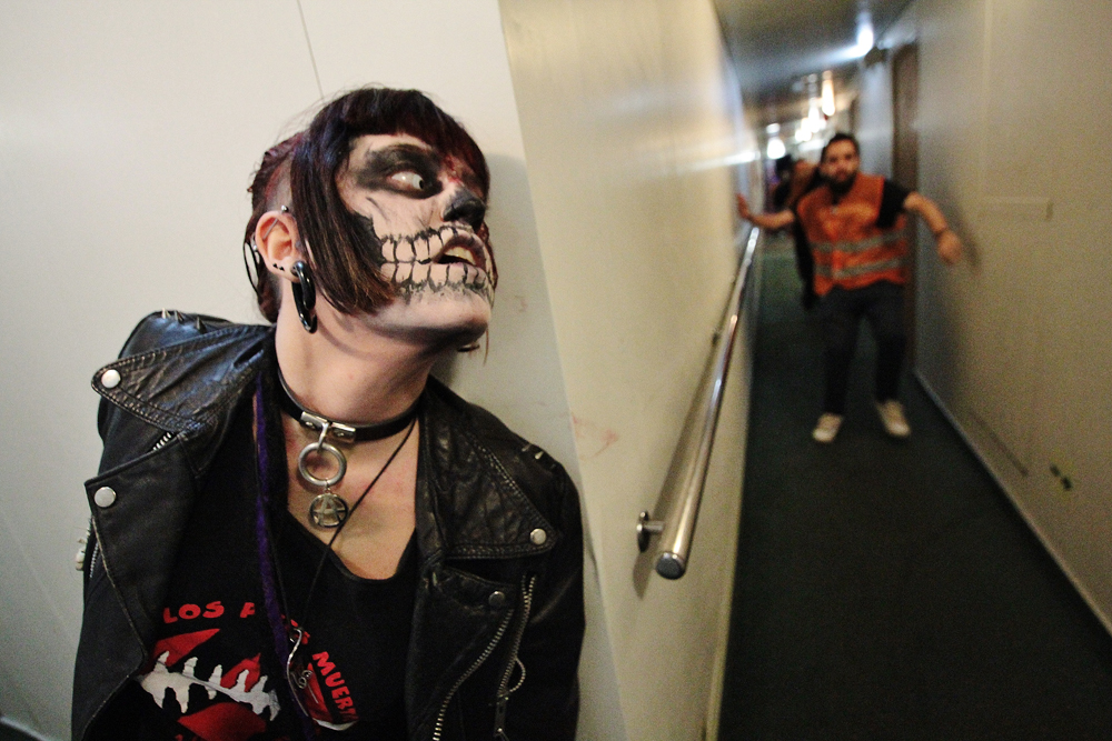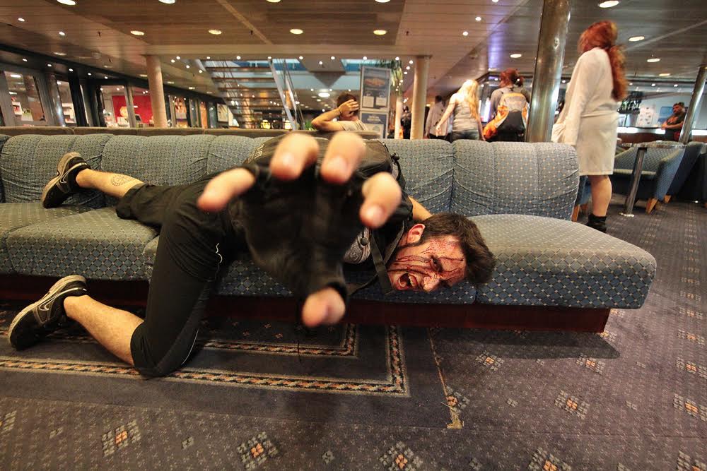 @B.R. / Aún no son las seis de la mañana y en el puerto de Botafoc unas 300 personas esperan con desgana que alguien los vaya a buscar para llevarlos a un hotel a descansar. No son ‘clubbers’, ni turistas despistados. Son los pasajeros del primer crucero zombie que ha llegado a Eivissa. Algunos aún muestran en su rostro la pintura que esta noche les ha dado un papel en el juego de rol organizado por Survival Zombie: Zombies vs. Supervivientes.