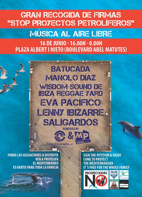@Noudiari / Alianza Mar Blava pide a los ciudadanos de Ibiza que acudan masivamente este sábado 16 de junio por la tarde a la Plaza Albert i Nieto (conocida por Boulevard Abel Matutes) de Ibiza para mostrar su apoyo a la protección del mar Mediterráneo frente a la amenaza de las prospecciones de hidrocarburos y de los sondeos acústicos con cañones de aire comprimido, los cuales generan un nivel de ruido submarino sumamente lesivo para todo tipo de fauna marina, especialmente para los cetáceos.