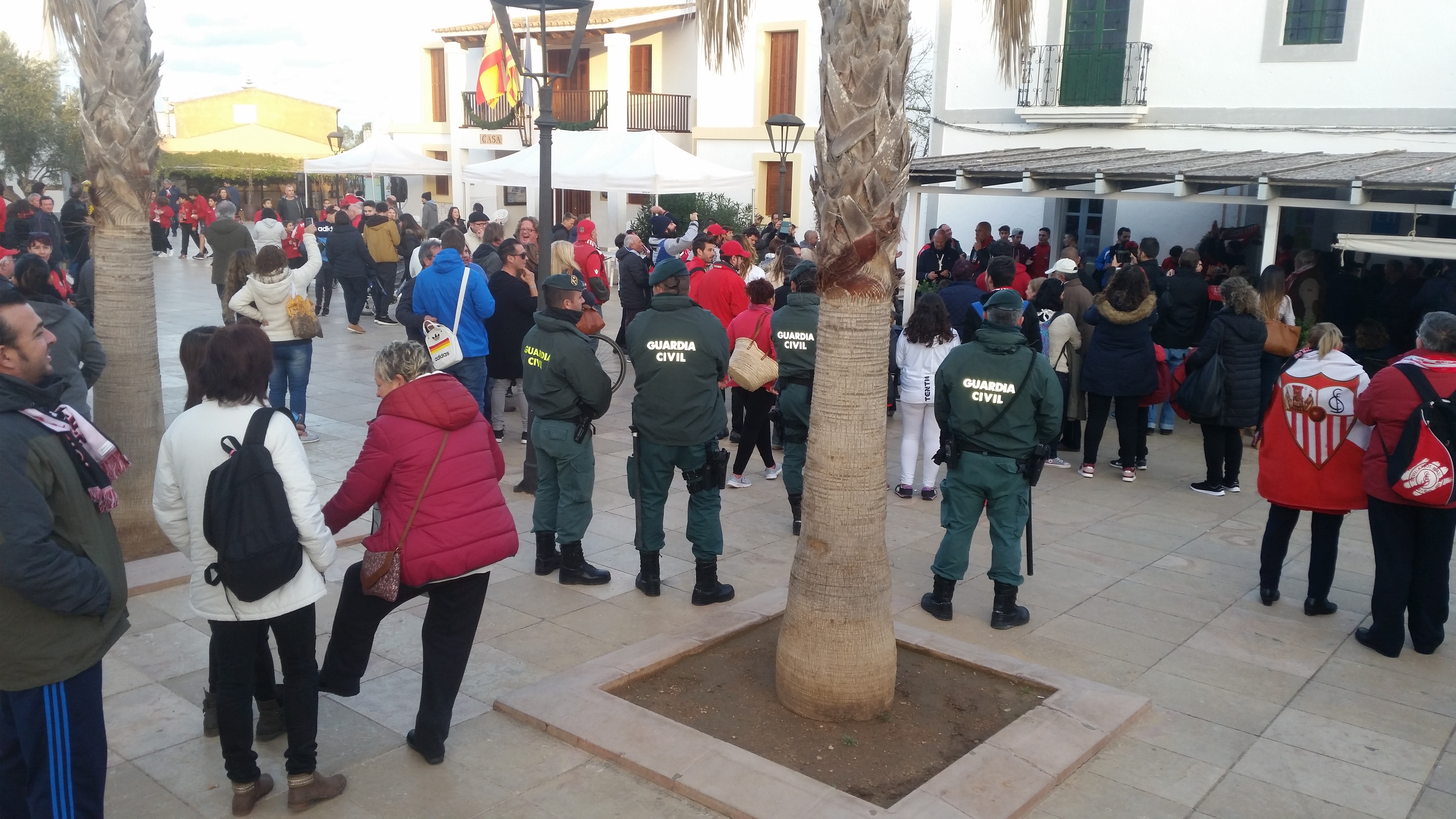 Aficionados del Formentera y del Sevilla se dan cita en la plaza de la Constitución, en Sant Francesc, para ir anando al campo de Formentera.