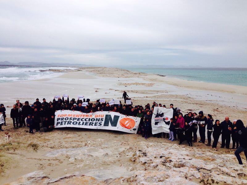 @Noudiari / Desafiando el frío y el viento reinante hoy en Formentera, más de un centenar de personas se han reunido esta tarde en es Trucadors, Illetes, para mostrar su rechazo a las prospecciones petrolíferas proyectadas cerca de las costas pitiusas. La convocatoria ha surgido a través de las redes sociales y ha volado como la pólvora entre la gente de la isla, que ha renunciado a la siesta y puntualmente, a las cuatro, ha acudido al punto de reunión, donde se han colocado estratégicamente sobre la arena para escribir con sus cuerpos la palabra ‘NO’, con la que escenifican su negativa a los planes de agujerear el subuelo marino de la zona en busca de hidrocarburos.