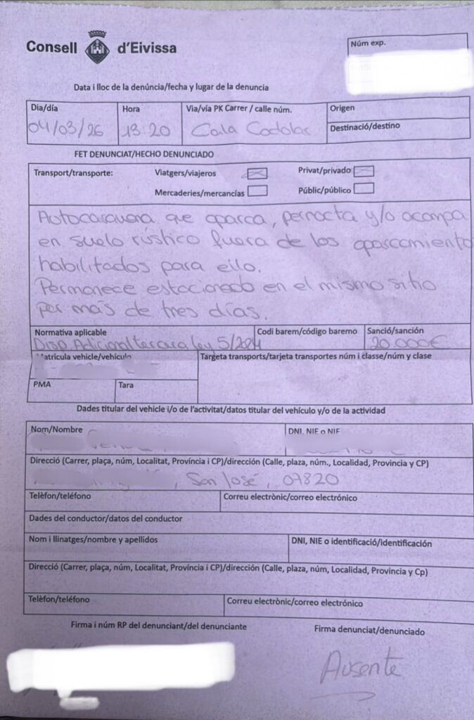 Una autocaravana estacionada en la zona de Cala Codolar, en el municipio de Sant Josep (Ibiza) ha sido sancionada con una multa de 20.000 euros por aparcamiento, pernocta y/o acampada en suelo rústico fuera de los espacios habilitados, según consta en la denuncia a la que ha tenido acceso este medio. La multa es de ayer miércoles 4 de marzo, está puesta a las 13.10 horas y la persona afectada es un trabajador, residente en Ibiza que tiene su puesto de trabajo en la zona, tal como ha sabido Noudiari.