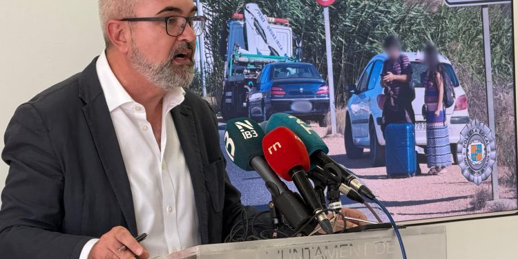 El alcalde de Sant Josep, Vicent Roig, acompañado por el Jefe de la Policía Local, José Antonio Granados, ha comparecido este miércoles para anunciar sanciones «más severas» por las actividades ilegales y la grave degradación del entorno detectados en esta zona durante la última inspección policial del martes.