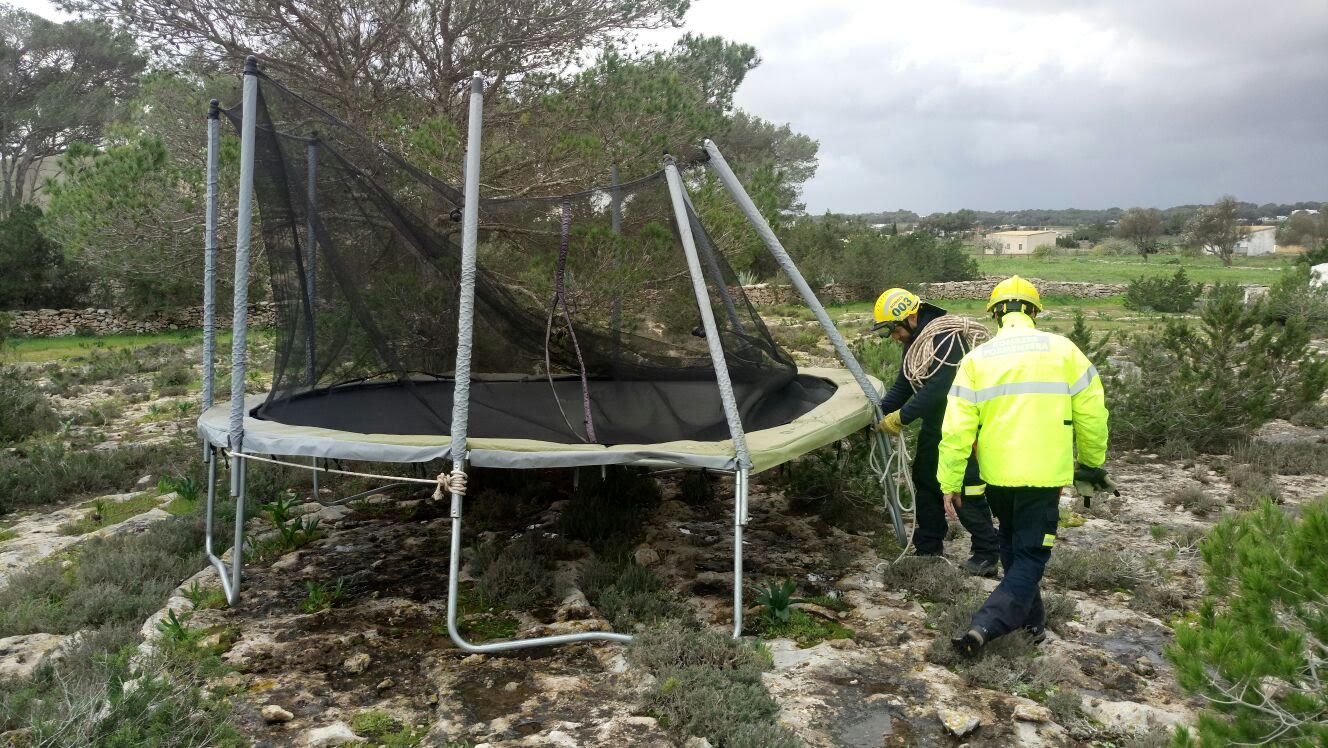 En Formentera, el parque insular de bomberos tuvo que intervenir en siete servicios, un incendio en un cuadro eléctrico en una vivienda por el impacto de un rayo en Porto Saler, tres árbole scaídos a la vía pública en Can Parra, Sant Francesc y es Cap de Barbaria, un desprendimiento de plancha metálicas en el techo en la gasolinera de Campsa, una cama elástica que salió volando en Sant Ferran y la caída de un poste de luz en el polígono industrial.
