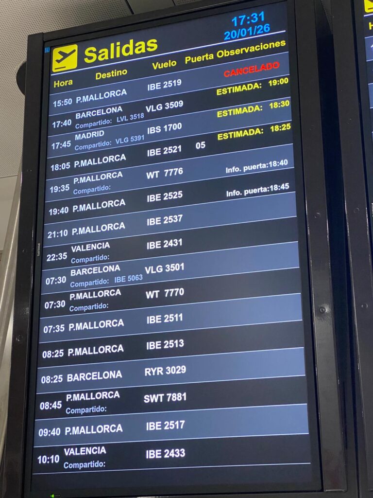 Las pantallas del aeropuerto de Ibiza ya indicaban sobre las 17,30 horas algunas cancelaciones provocadas por la imposibilidad de algunas naves aéreas de llegar a Ibiza desde otro origen previo.