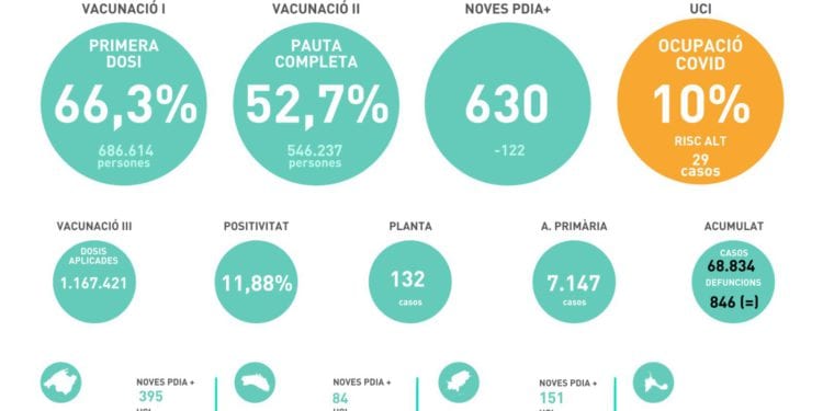 Mientras tanto, el proceso de vacunación avanza en Baleares: el 52,7 % de la población diana (546.237 personas) ya ha recibido la pauta completa para inmunizarse y el 66,3 % (686.614) la primera dosis.