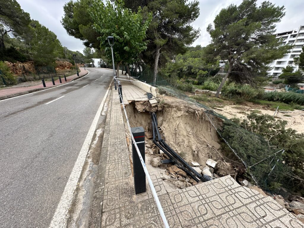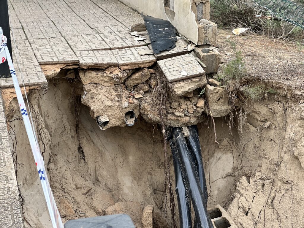 El empresario Dani, con varios locales en la zona, nos indica algunos de los daños más severos: una parte de acera hundida con un boquete enorme junto al paseo. “Ahí debajo se ven los tubos del saneamiento. Por ahí bajó el torrente como si fuera un río. Es peligroso”, alerta.