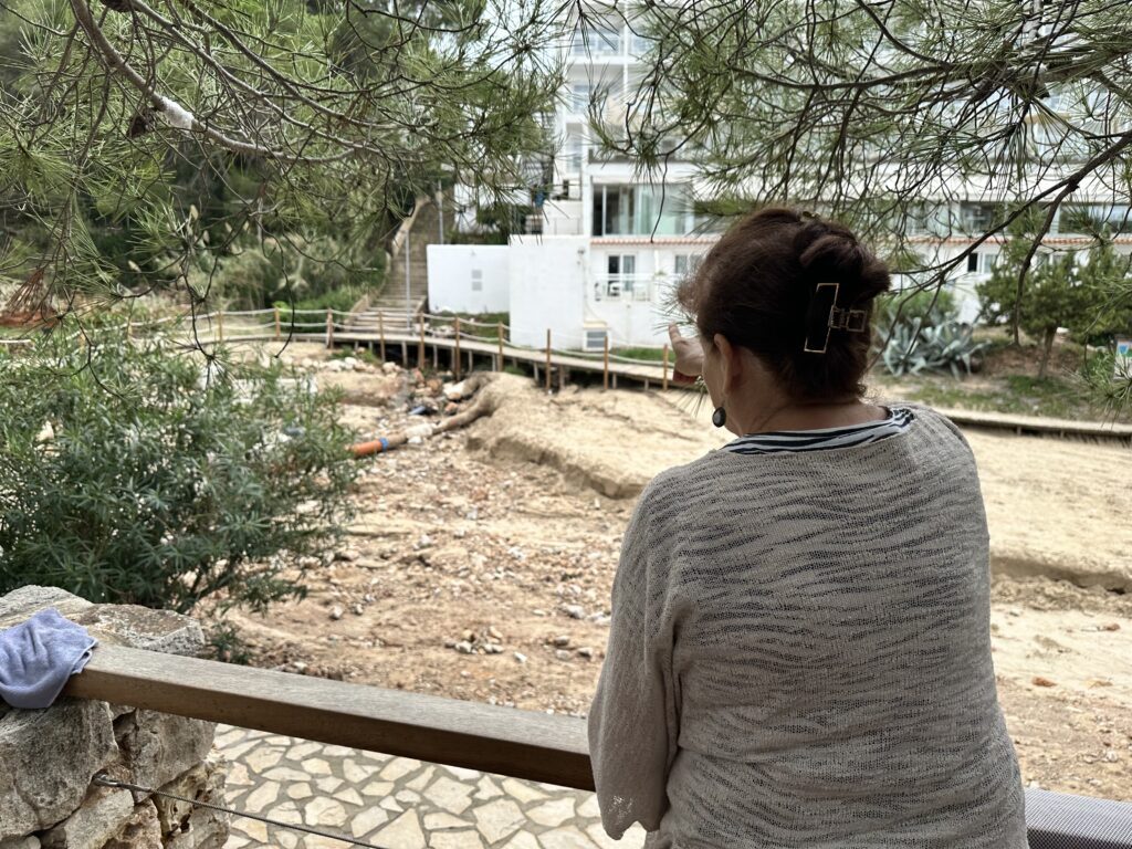 Maria Torres, al frente de un negocio de souvenirs que lleva 53 años de historia, señala los destrozos de la riada junto al hotel Grupotel Ibiza Beach Resort. Fotos Noudiari.es L. F. A.