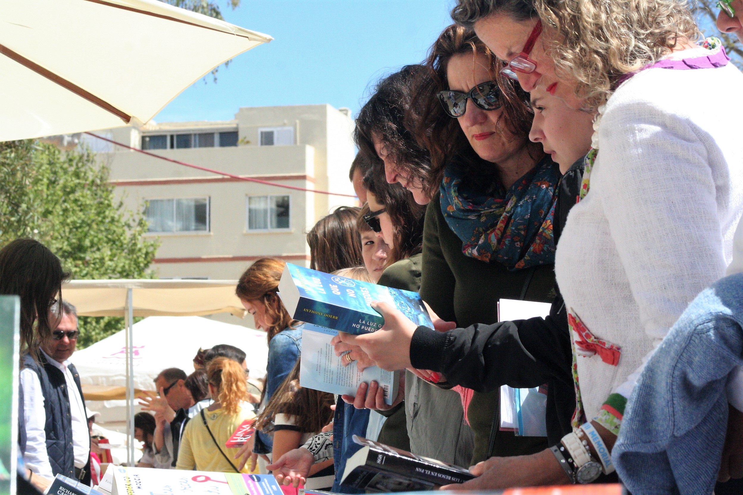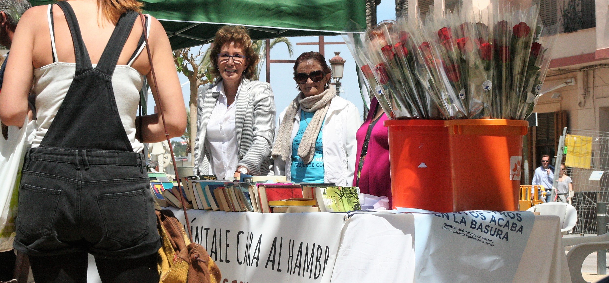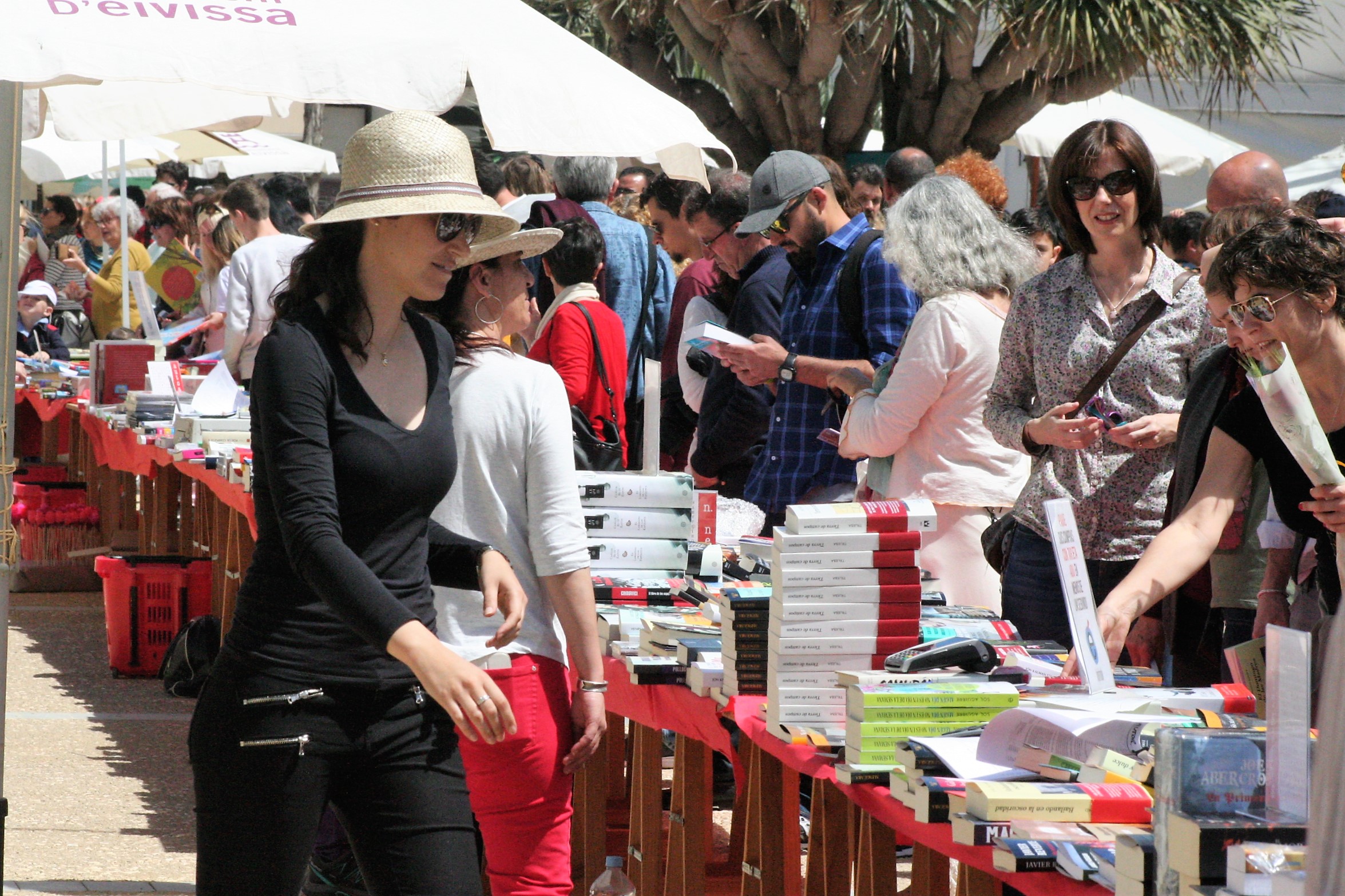 @Pablo Sierra del Sol / Las vallas que delimitan la zona de obras de Vara de Rey se han retirado justo a tiempo para que por el paseo avancen las ganas de leer de los ibicencos que esta tarde se han sumado a la celebración de Sant Jordi. Un 23 de abril más, las mesas que librerías y asociaciones culturales han montado en el corazón de Vila, no han dejado de despachar novelas, poemarios, libros de autoayuda o de cocina durante una jornada en la que ha reinado el sol de primavera. Los más pequeños, aunque parezcan condenados a desterrar definitivamente el papel por la pantalla, también han disfrutado de lo lindo.