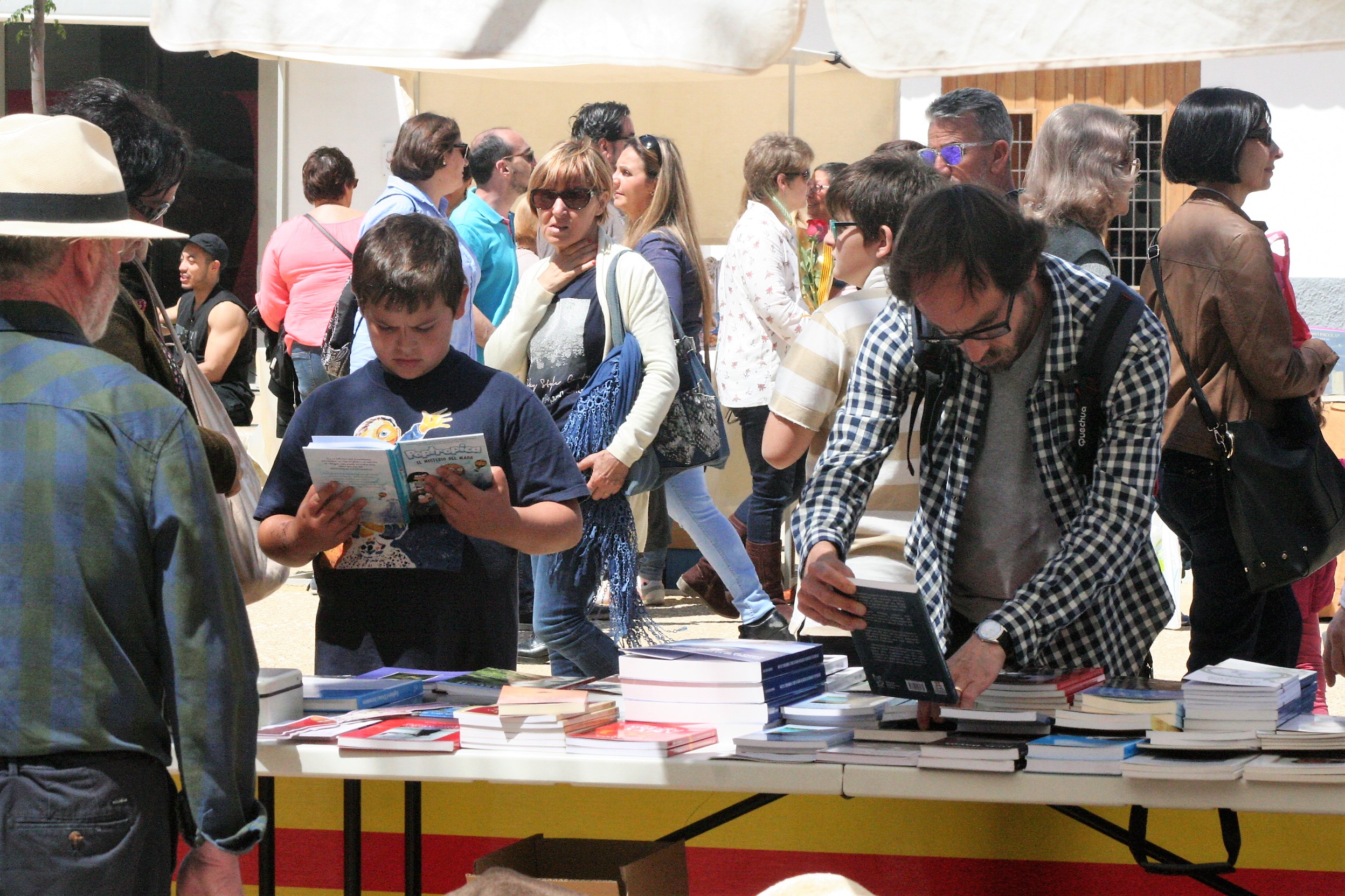 Una treintena de chavalines escuchaba con atención a los dos cuentacuentos que actuaban alrededor de las cinco de la tarde en una pequeña carpa. Las encuestas dicen año tras año que el interés por la lectura no abandona un nivel que no invite al pesimismo, pero la curiosidad de algunos pequeñajos por los libros infantiles ha sido evidente durante todo el día.